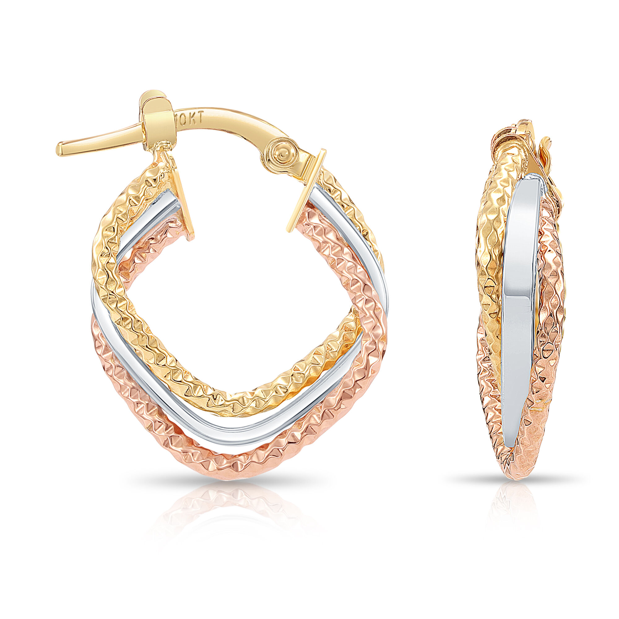 TILO Jewelry 10K Real Solid Tri-Color Gold Diamond-Cut Twisted Square Creole Hoops Earrings All Shiny Polished Hand Engraved Textured Dainty Twisted Square Chunky Hoops Ring Earrings Women, Girls, Unisex