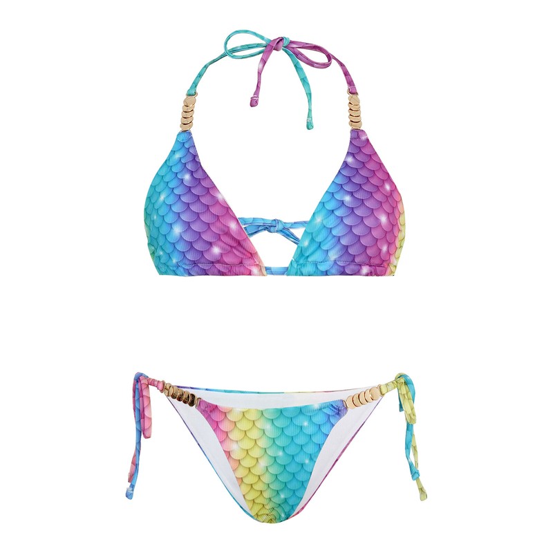 Two piece bikini top and bikini bottom for women, with colorful fish scale print and metal circles.