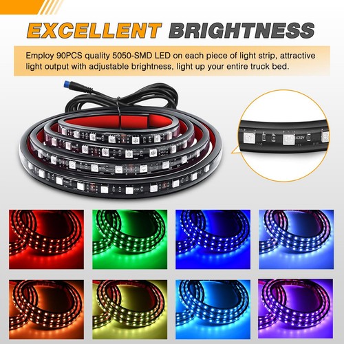 Easy To Install: The RGB truck bed light strip comes with self-adhesive tape and extra cable ties, screws and fasteners, just clean the mounting location with alcohol and dry, peel and stick the light bar on any surface you want