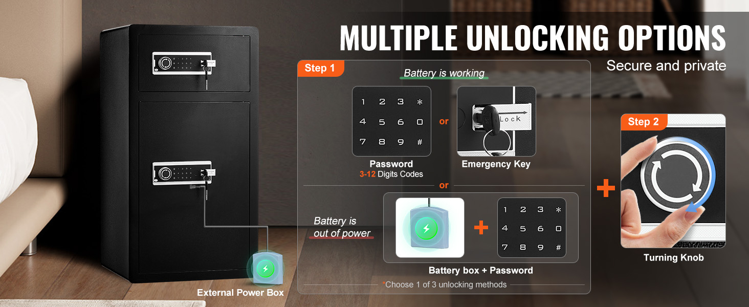 Enhanced Security: Our safe and lock box offers 3 unlocking methods: using a key or a 3-12 digit code. Additionally, if you lose the key and the lock’s battery is depleted, you can still use an external battery pack to power the lock and access the safe using the password.
