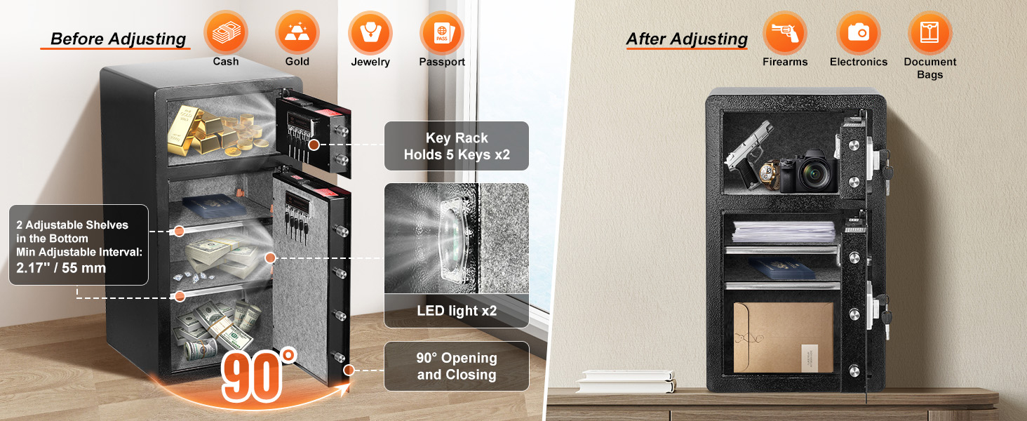Height Adjustable & Removable Divider: The divider help you easily organize important items, allowing you to add or remove shelves as needed. The built-in LED light enhances visibility, making it easy to access valuables even in the dark.
