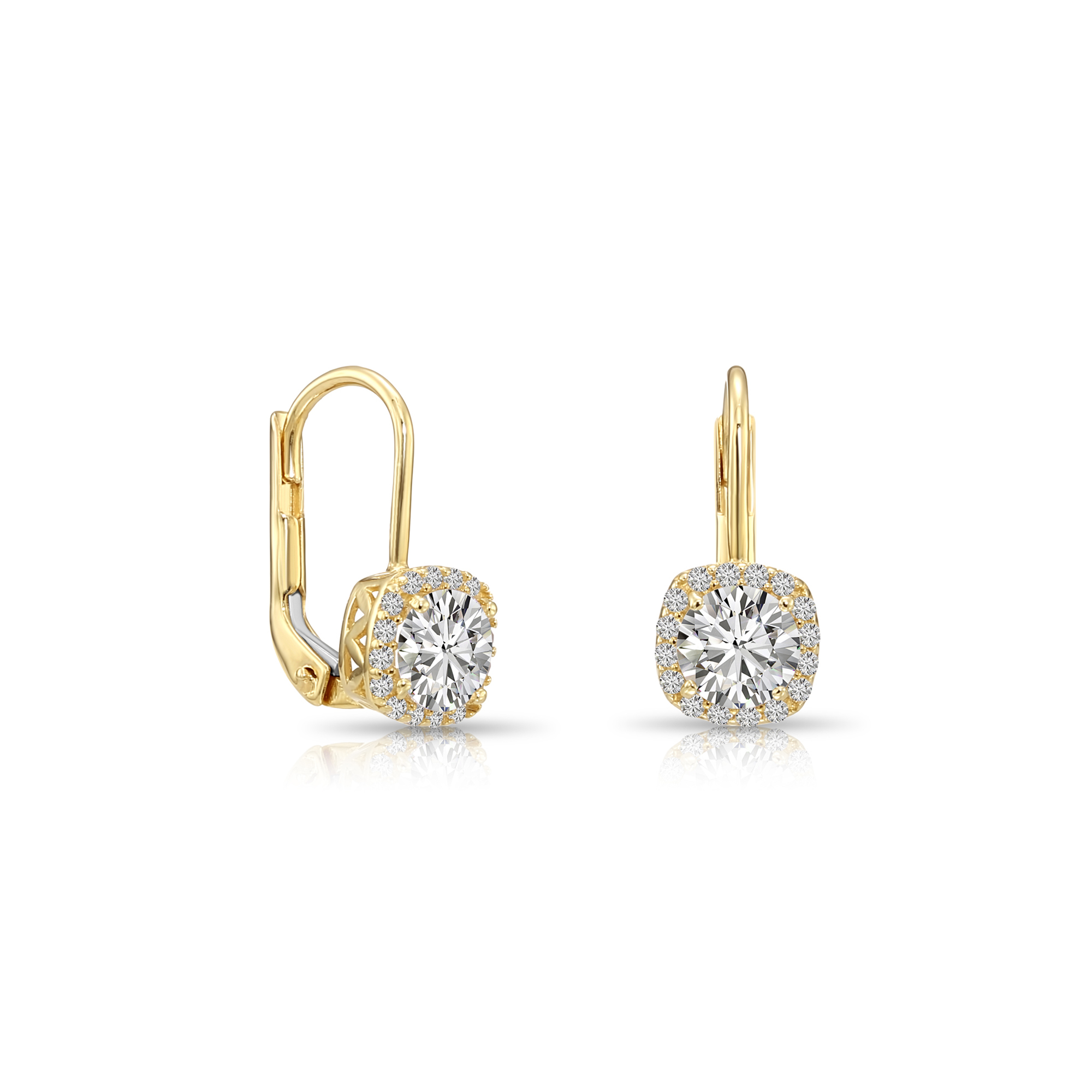 Our halo drop earrings are handcrafted from 14K real solid gold, featuring a round brilliant-cut simulated diamond at its center to be full of shine and sparkle. These beautiful drop earrings are adorned with cushion-shaped halo-set, dazzling, super clear white zirconia, which shimmers for extra shine like a diamond. With the comfortable and sturdy French lever-back closer, you can wear these earrings all day, every day, without worrying about them falling off!