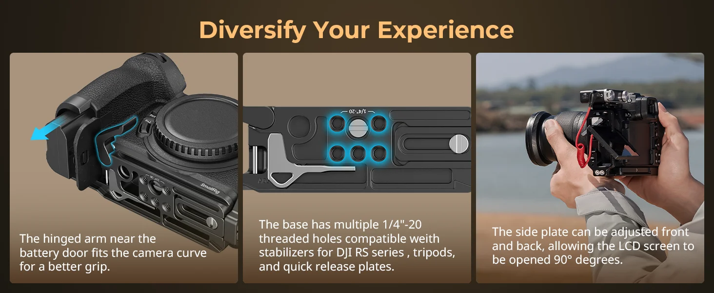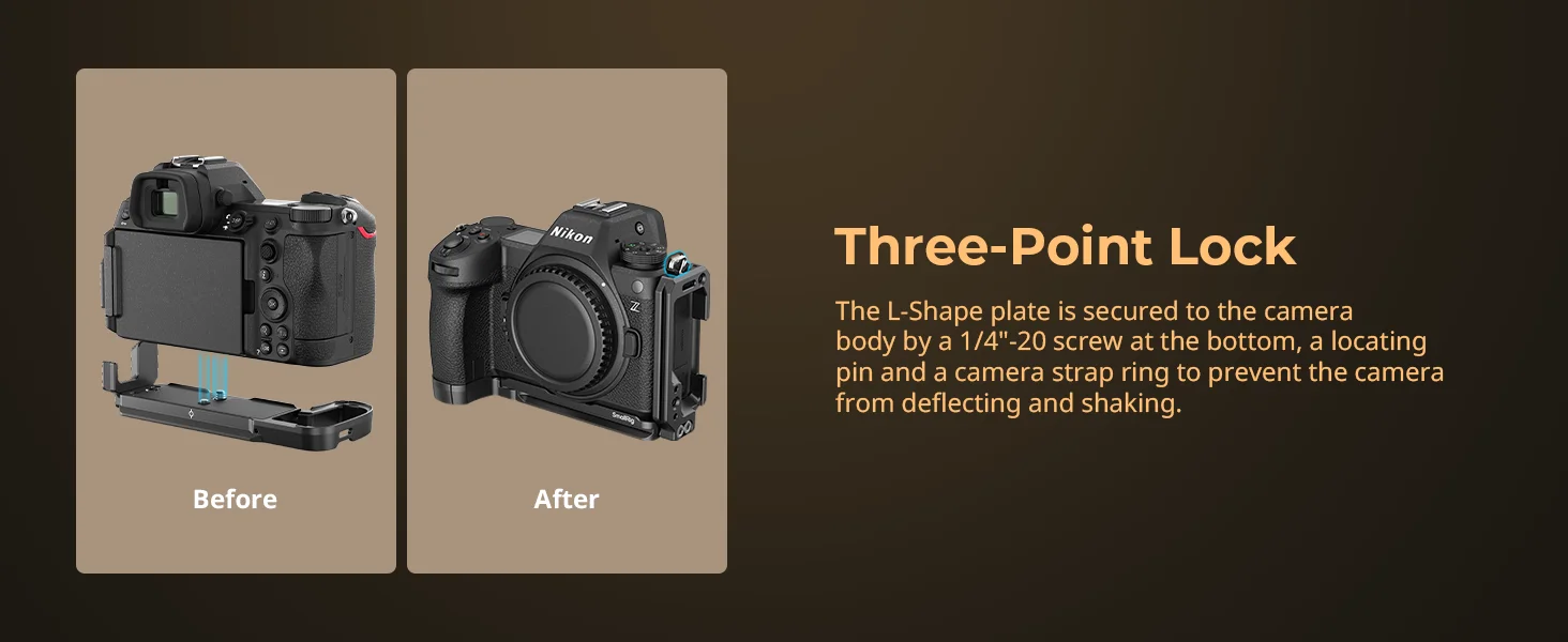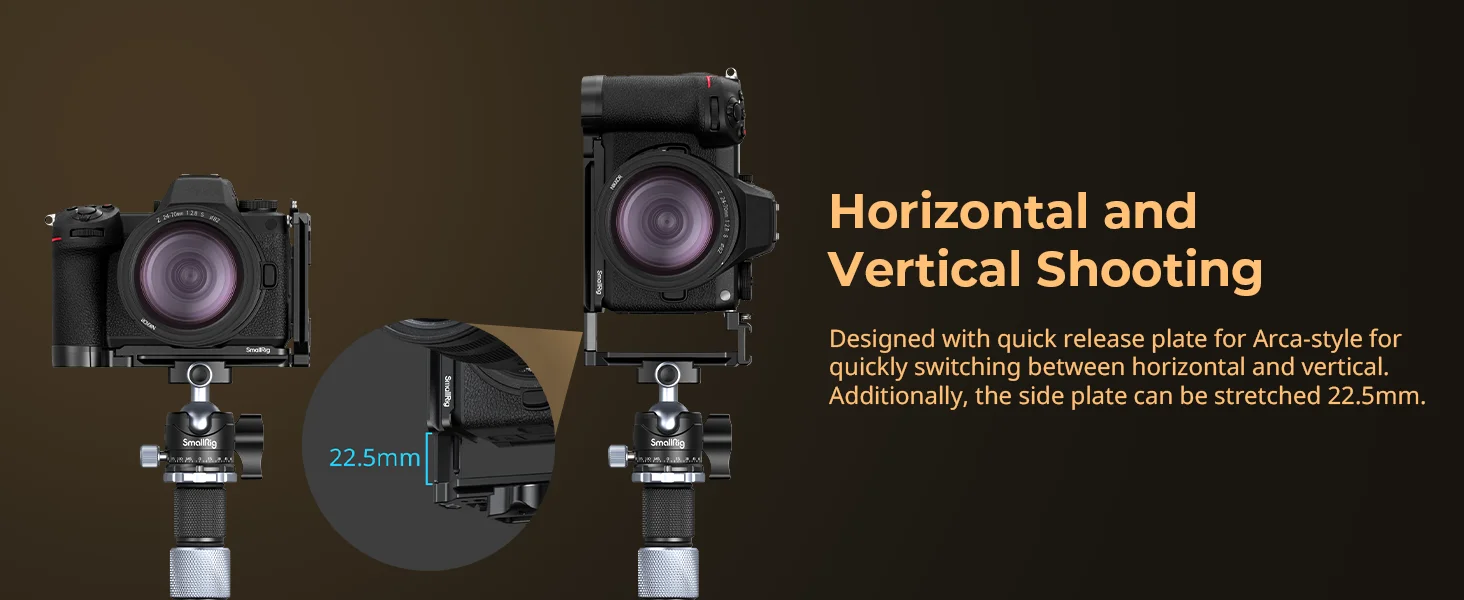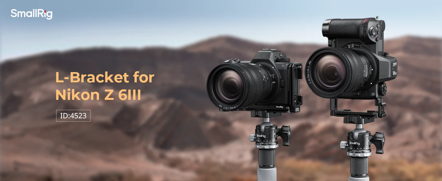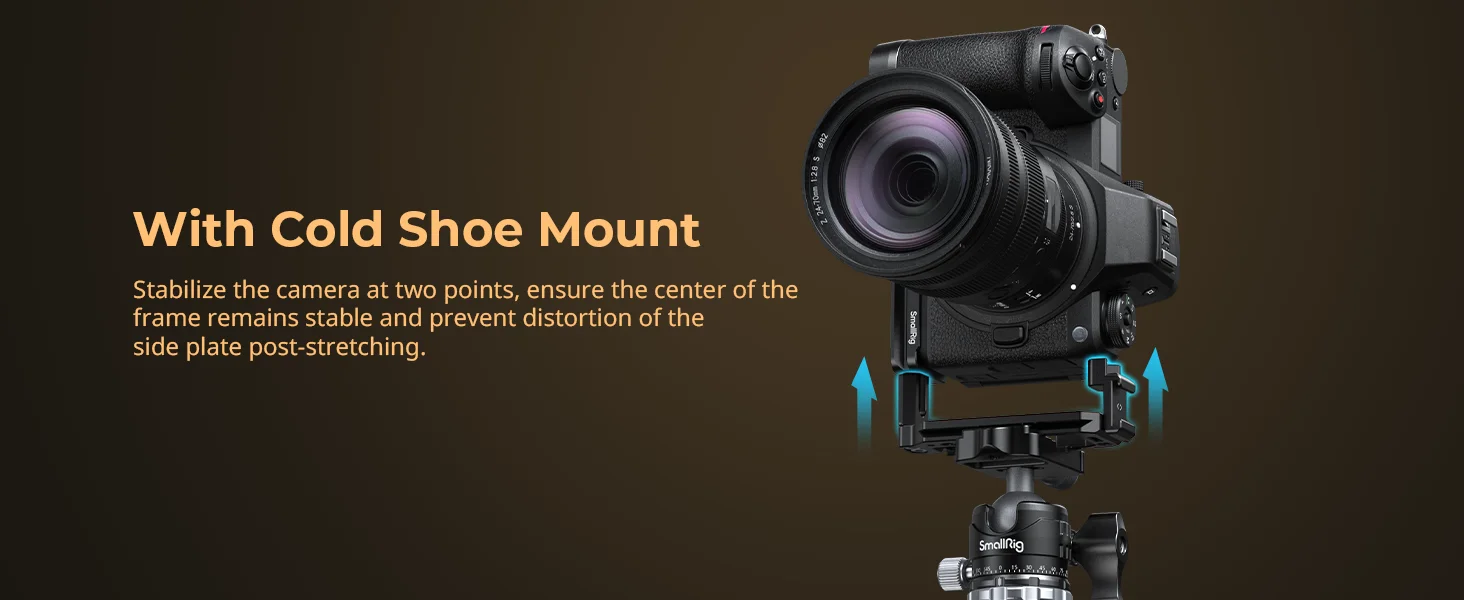 SmallRig L-Shape Mount Plate for Nikon Z 6III 4523 is designed to facilitate a quick transition between landscape and portrait orientations, enhancing both shooting versatility and camera grip. Three-point locking system ensures stability and prevents twisting by securing the camera with a 1/4"-20 screw at the base, a locating block, and the left shoulder strap ring, while integrated pads prevent the camera from scratching. The locating block with the built-in cold shoe mount provides support to stabilize the cage and prevent distortion after extending the side plate in portrait mode. It is also compatible accessories with cold shoe mounts, such as microphones (ID 3487), LED video lights (ID 3286B), image transmission systems, flashlights, etc., providing a lightweight solution to photography or shooting. The side plate can be extended by 22.5mm (0.9in) for convenient cable routing in portrait orientation. Integrated Arca-Swiss quick release plate on the base supports Arca-type tripod (ID 4353, 4060) or DJI RS 2 / RSC 2 / RS 3 / RS 3 Pro / RS 4 / RS 4 Pro gimbals. The bottom features built-in 1/4"-20 and 3/8"-16 threaded holes, allowing seamless compatibility with side handles (ID 2093, 3847) for handheld vertical shooting solutions, as well as the tripods (ID 3989, 3751). The bottom is equipped with a strap hole, compatible with wrist / shoulder straps (ID 3848, 2456). A built-in QD interface supports shoulder straps (ID 4118). Additionally, the side panel includes a 1/4"-20 locating hole for accessories such as magic arms (ID 3875). The hinge arm at the battery compartment fits the camera curves and improves its grip comfort. The plate features a built-in magnetic flat wrench at the bottom for easy disassembly and assembly