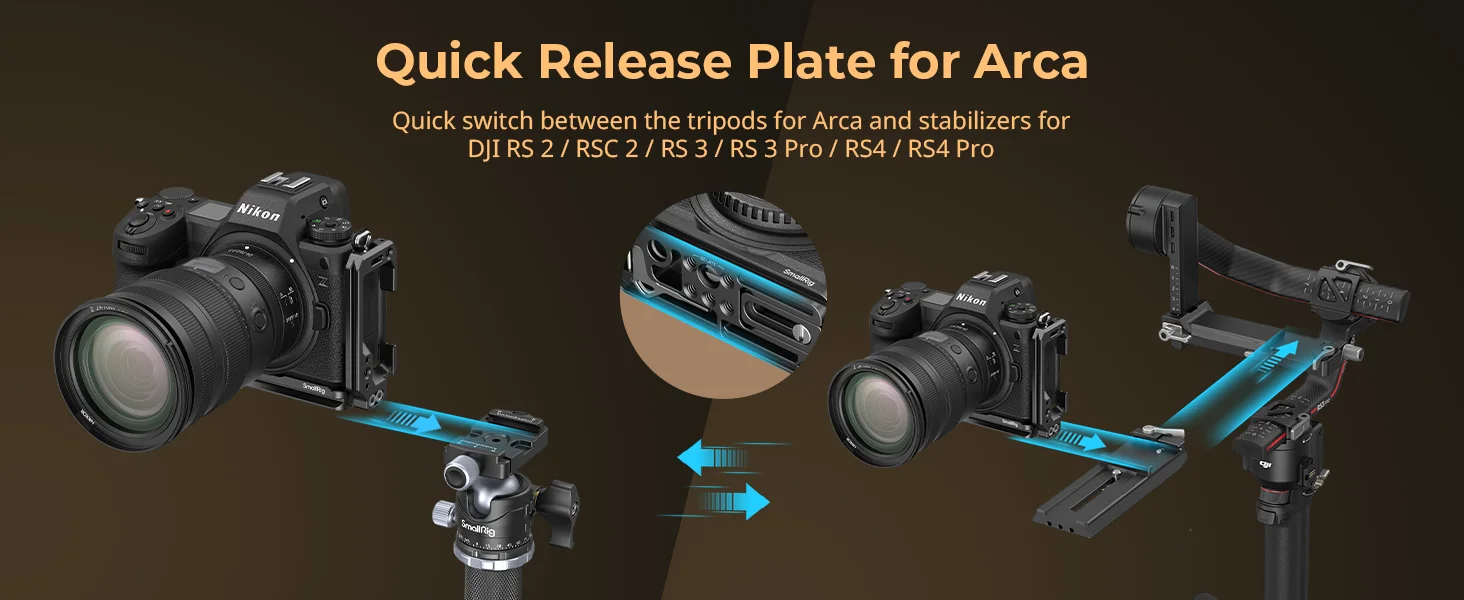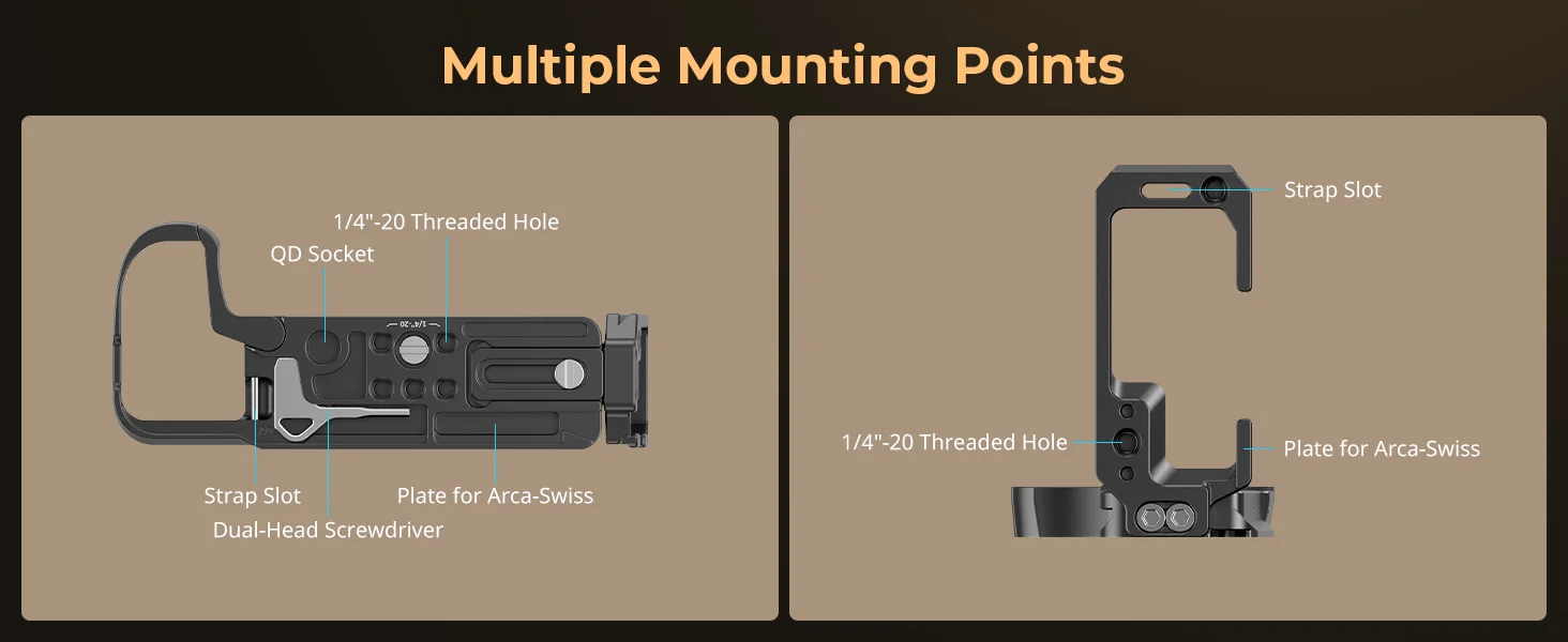 1. Dual Arca-Swiss design with quick release plates on both the base and side of the L-Shape Mount Plate, enabling smooth transition between landscape and portrait orientations on tripods;