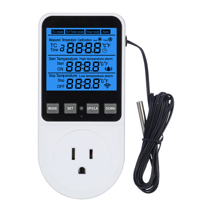 TC modeThis mode is for temperature control without a timer set. Set start temperature and stop temperature, when start temperature < stop temperature, the temperature controller plug will work in heating mode; When start temperature > stop temperature, it will work in cooling mode. | TC+Timer modeTwo or three different temperatures can be set for time cycling within 24 hours during the day and night. For example, you can maintain the temperature of the breeding room between 6:00 and 19:00 at 18-21 ℃, and between 19:00 and 6:00 the next day at 22-24 ℃. A maximum of 3 time periods of temperature can be set within 24 hours. | Timer modeWith ON/OFF time setting per day, Timer mode is used to turn on and off the device in two time periods of 24 hours. For example, set Time 1 ON=6:00, Time 2 OFF=20:00, the device will be turned on from 6:00 to 20:00 and turned off from 20:00 to 6:00. | AlarmThe temperature controller also has high or low temperature alarm and low temperature alarm functions. Press the "MODE" button to swithing the "Alam MODE", Press the SET button to sert high temperature alarm and low temperature alarm numerical value. |