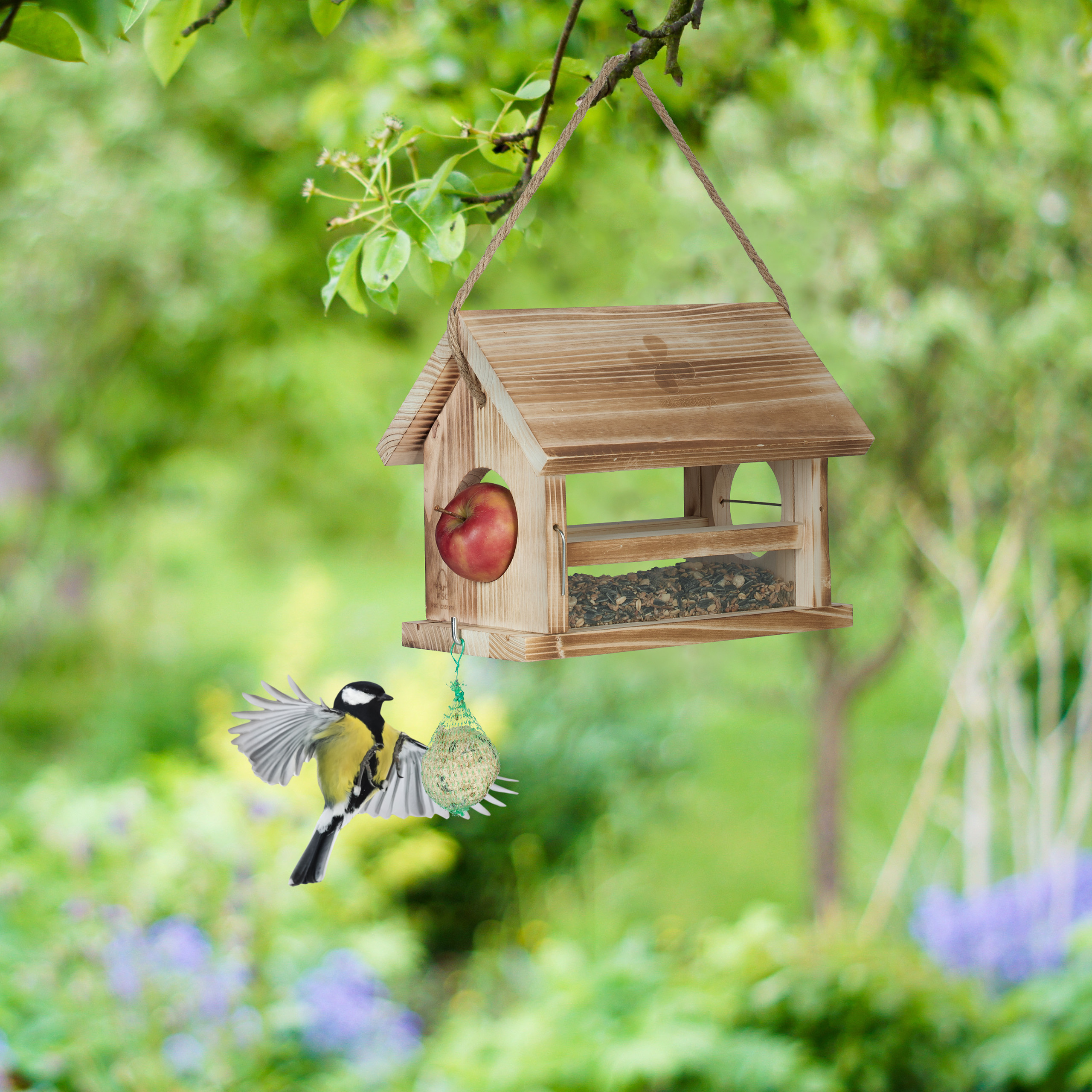 Mit diesem tollen Vogelfutterhaus machst Du kleinen Wildvögeln eine große Freude. Die geräumige Futterstelle kann mit Samen und Körnern befüllt werden. Dazu kannst Du einfach das Dach frontal öffnen. Zusätzlich verfügt das Vogelhaus über ein Meisenknödelhalter und zwei Apfelhalterungen. Das Dach schützt das Futter vor Regen und sorgt somit für längere Haltbarkeit. Aufgrund des wetterfesten Holzes kannst Du die Futterstelle ganzjährig in Deinem Garten an der stabilen Kordel aufhängen.