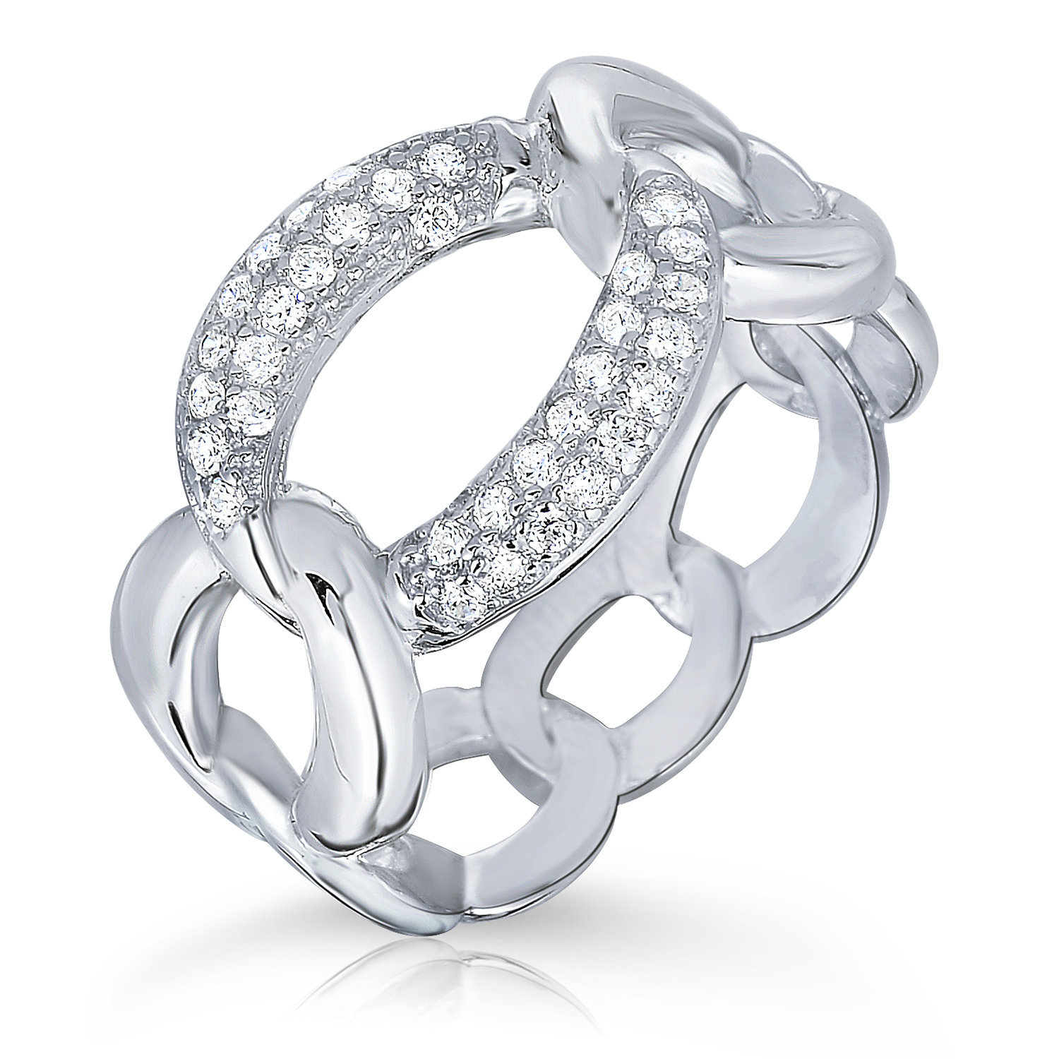 TILO Jewelry Solid 925 Sterling Silver Pave Cuban Curb Chain Link Statement Braided Ring with Simulated Diamond CZ Stones, Classic Micro Pave-set Graduated Cuban Curb Link Chain Statement Engagement Wedding Band Ring Men, Unisex