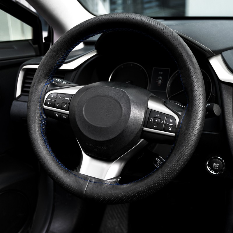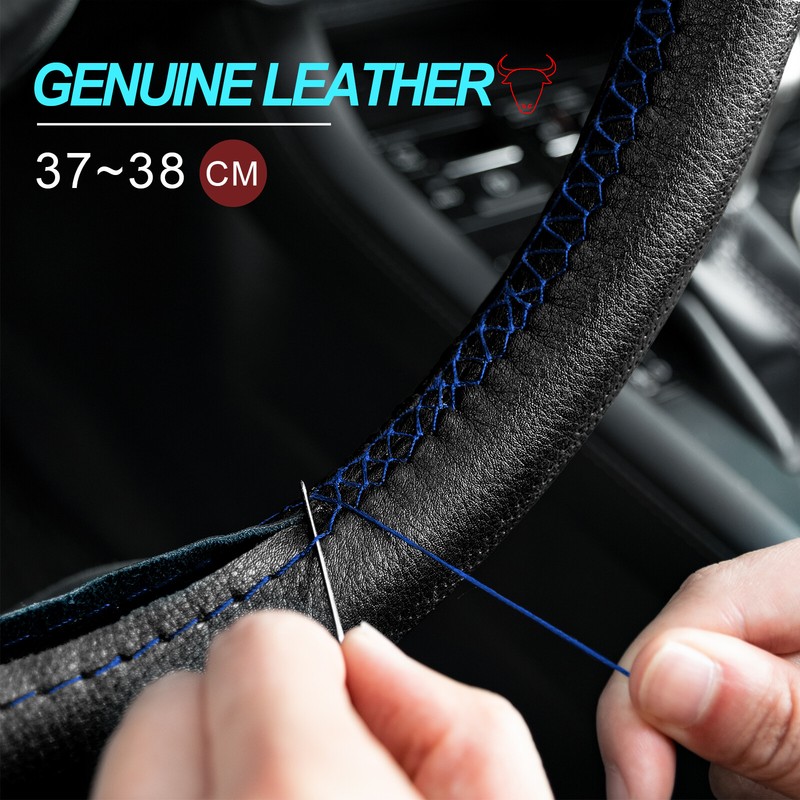 Genuine Leather DIY Car Steering Wheel Cover Anti-slip For 15"/38 cm Black Blue