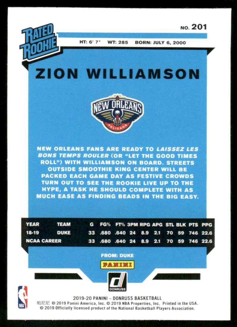 | 2019-20 Donruss Rated Rookie Zion Williamson #201 BB2-3 |