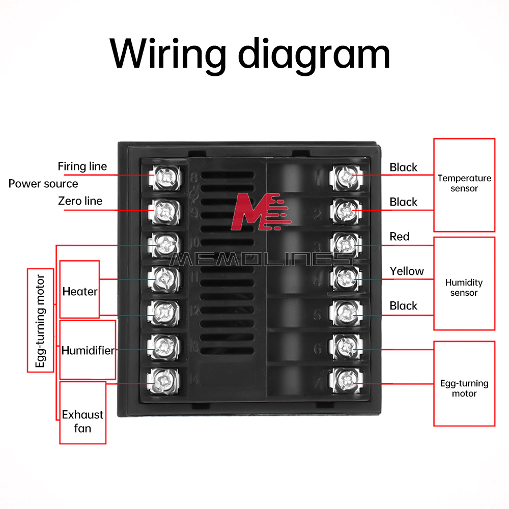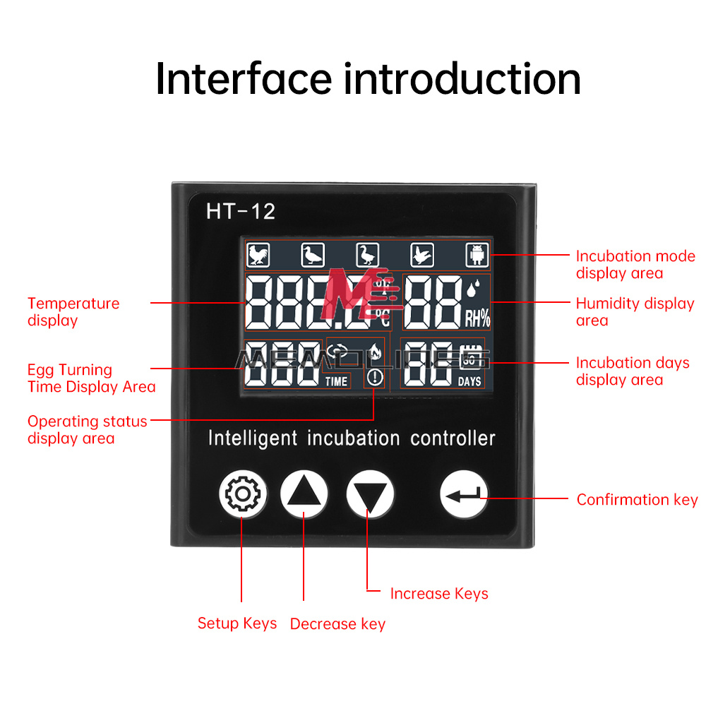 Maximum load current of control output: temperature control ≤5A/AC 220V/110V, humidity control, over temperature, egg turning <3A/AC 220V/110V