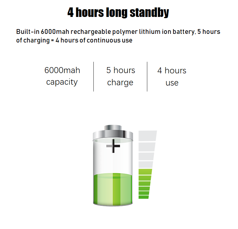17.Built in 6000mAh rechargeable lithium battery,Fully charged for 4 hours of continuous use at the