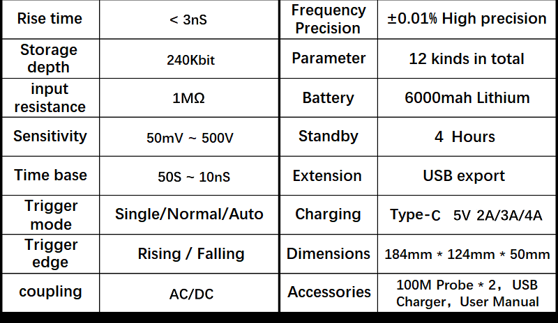 6.Up to 12 parameters measurement:VPP,VP,Vmax,Vmin,Vavg,Vrms,Frequent,Duty+,Duty-,Time+,Time-,Period