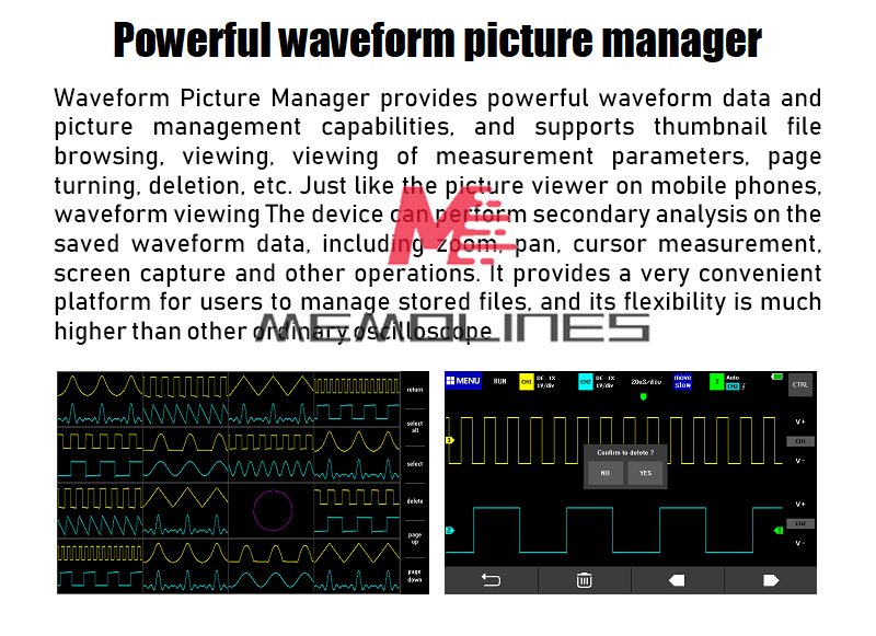 Extremely convenient screenshot And waveform storage function, built-in 1GB storage space, can store up to 1000 screenshots + 1000 sets of waveform data, the storage process is simple and fast, save the current waveform anytime, anywhere with a single touch, no cumbersome prompts and choices, keep calm The current data is saved in the place, which is very convenient;