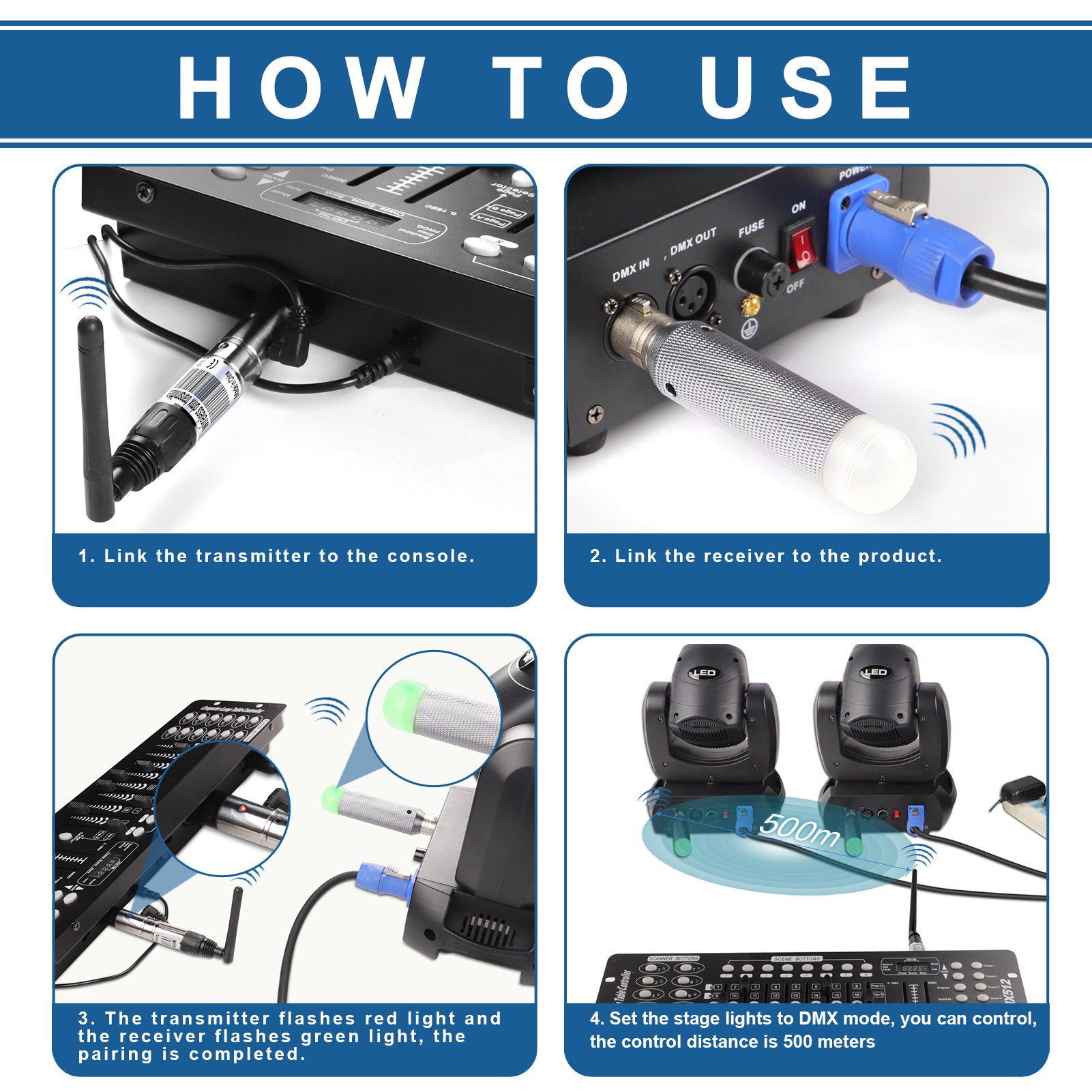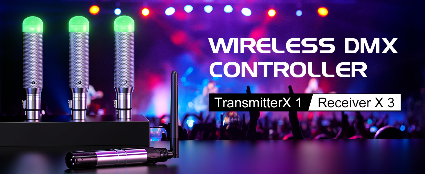 Control mode: controlled by DMX512 console. The transmitter is plugged into the dmx console, the receiver is plugged into the fixture