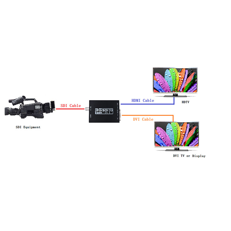 l The SDI to HDMI+DVI converter allows SD-SDI, HD-SDI and 3G-SDI signals to be shown on HDMI and DVI displays while ensuring high bit rates of 2.970 Gbit/s to give you fast signal transmission without any loss