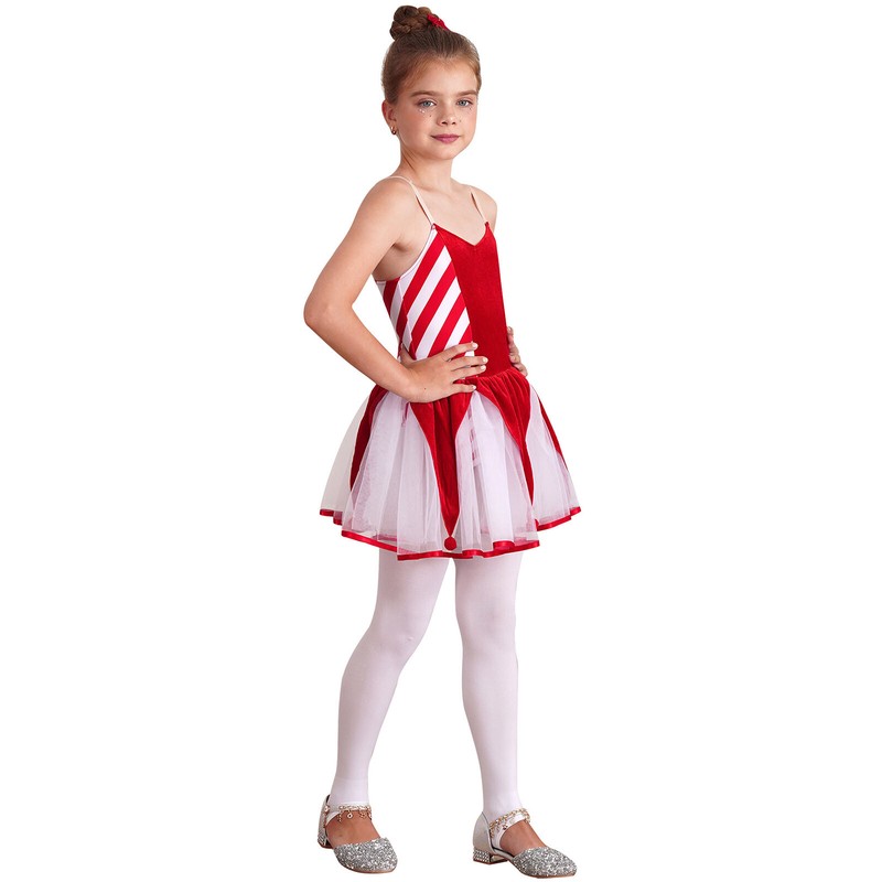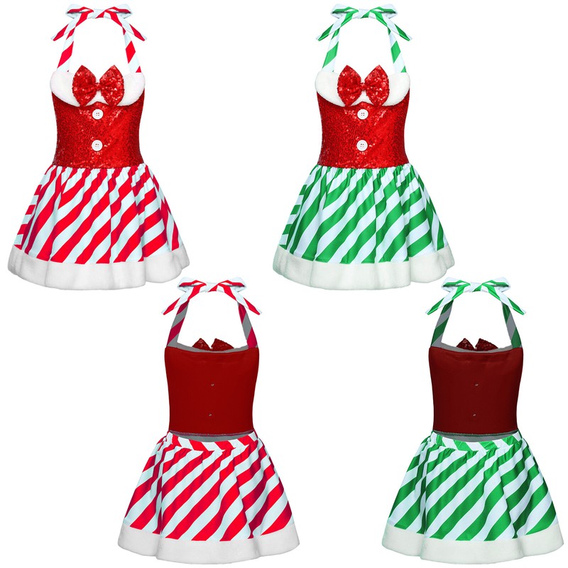 Christmas dress costume for girls, with adjustable straps and stripes print design.