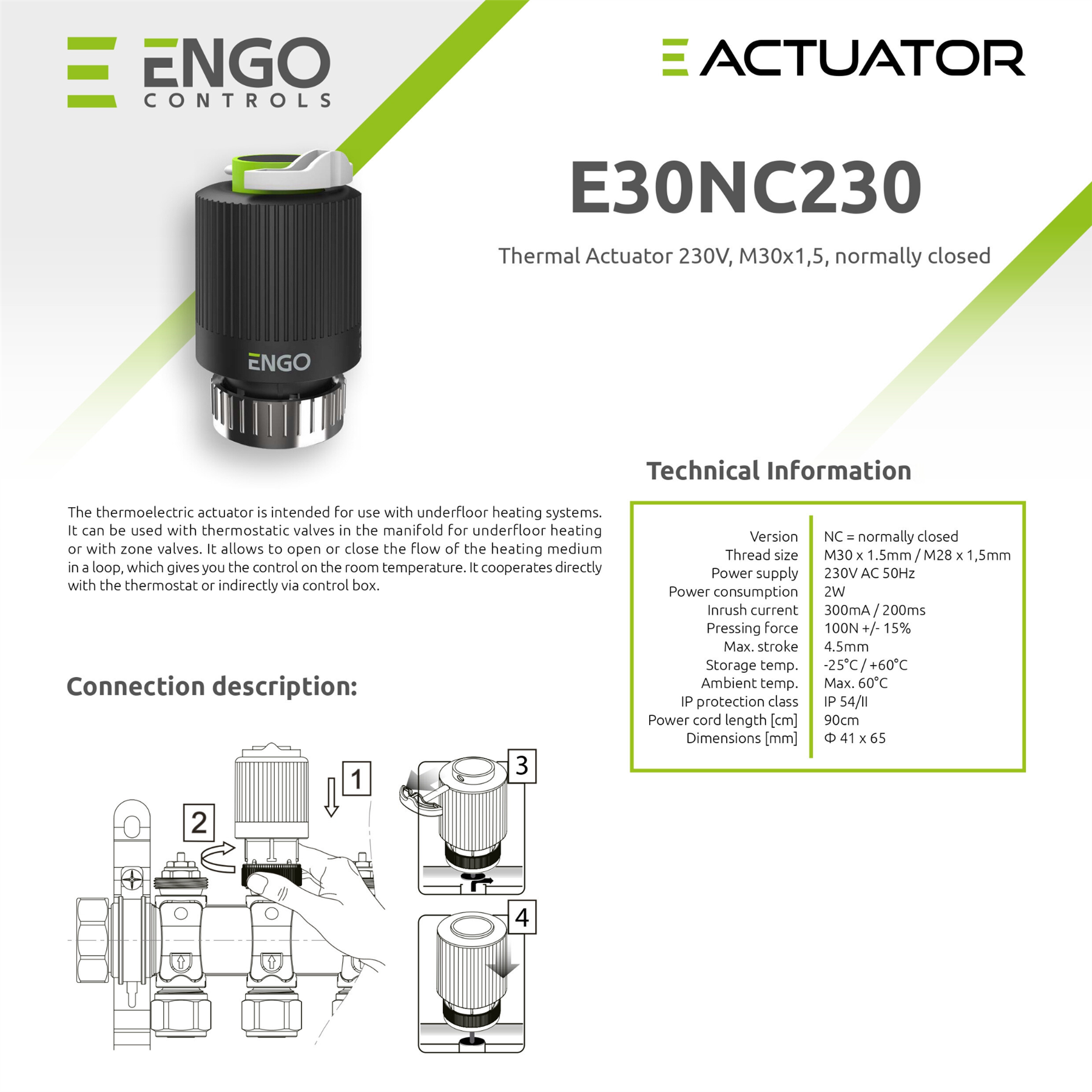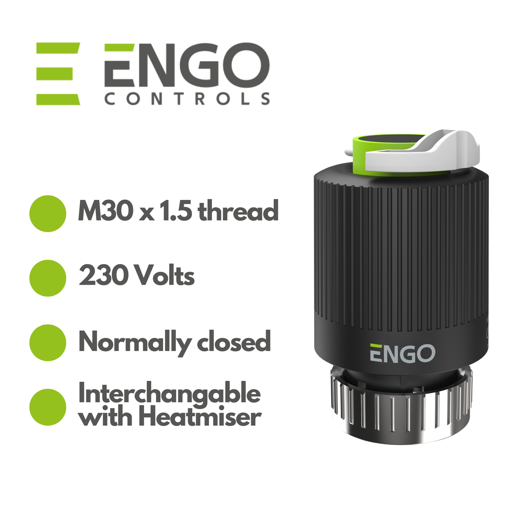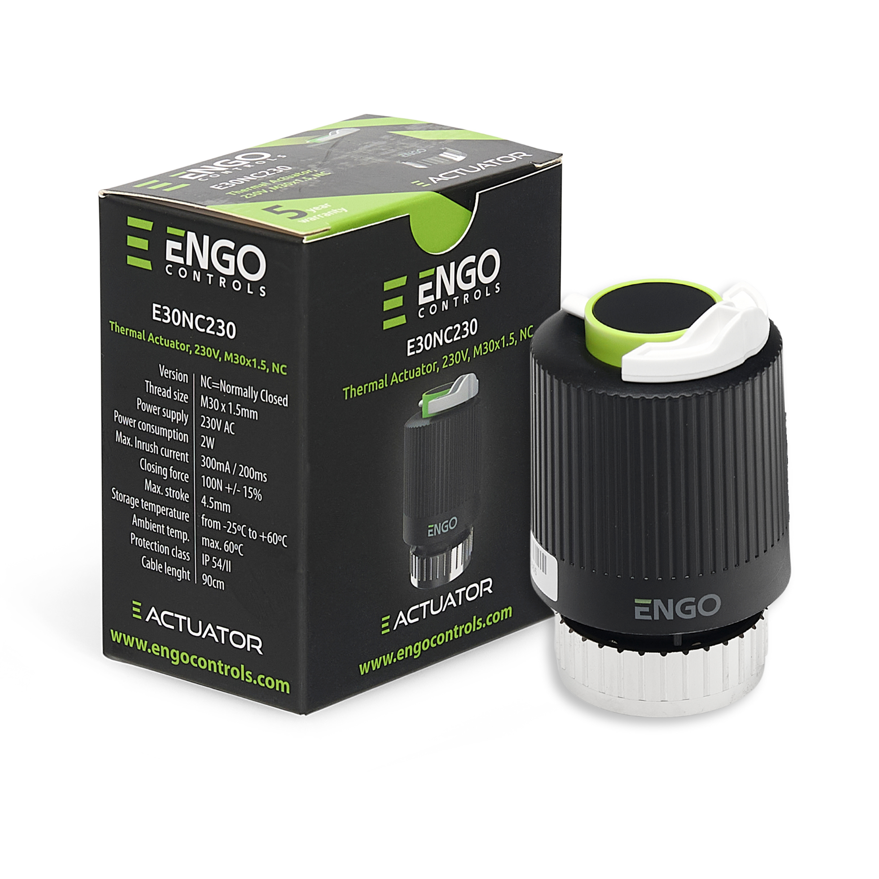 The ENGO E30NC-230 Thermal Actuator is a high-performance solution specifically designed for use in underfloor heating systems. Engineered for reliability and efficiency, this thermal actuator operates at 230V and features a M30x1.5 connection thread, making it compatible with most underfloor heating manifolds. The actuator is normally closed (NC), meaning it opens the valve only when power is supplied, ensuring energy is conserved when not needed. This design is ideal for maintaining comfortable temperatures while reducing unnecessary heating costs. The compact and robust design ensures the actuator can be easily installed in tight spaces and provides years of maintenance-free operation. With precision control over heating circuits, it guarantees optimal flow and distribution of heat throughout the home or commercial property. The ENGO E30NC-230 is the perfect choice for anyone looking to enhance their underfloor heating system with a reliable and efficient actuator.