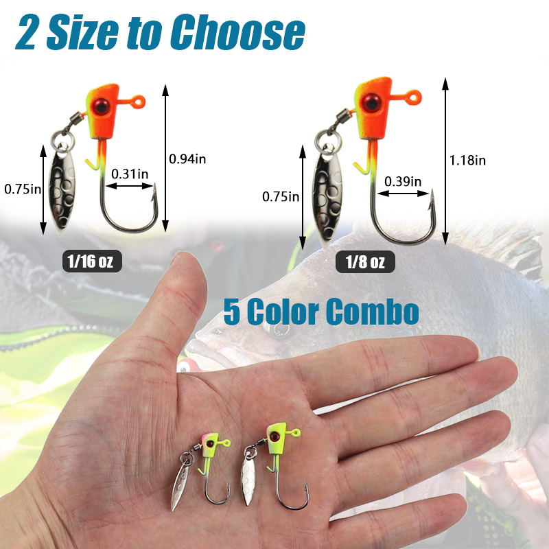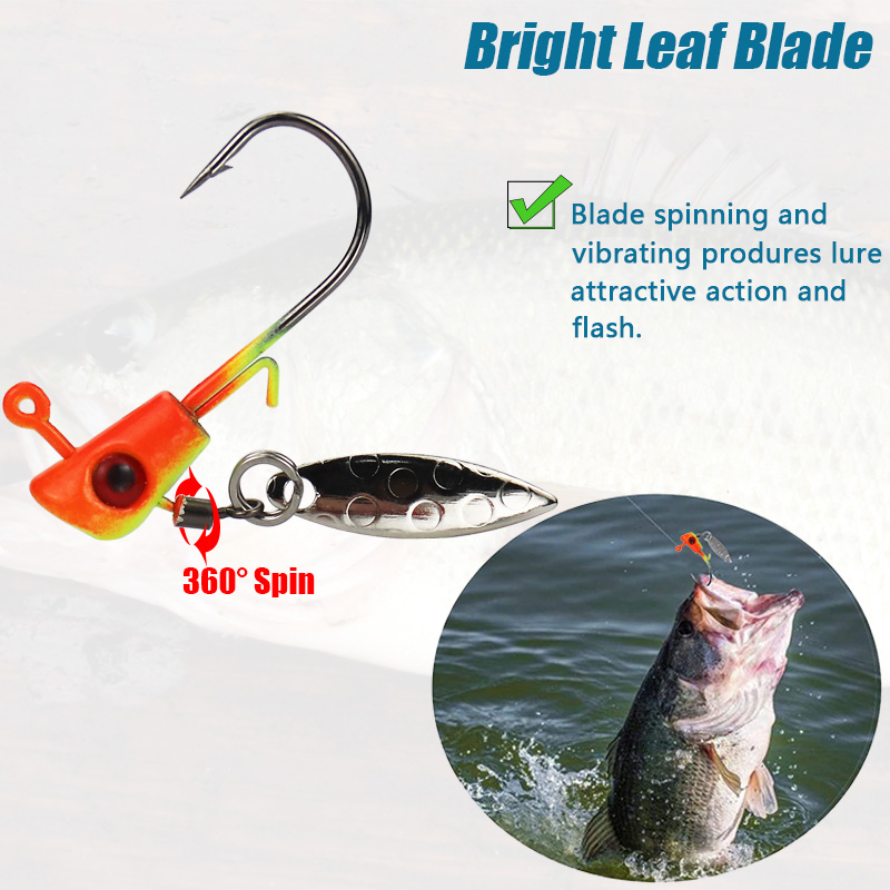 【UNIQUE DESIGN】 Each head jig hook lure with a spinner blade is designed with a vibration leaf blade and vibrant color and big bright 3D eye, painted with long-lasting luminous powder-coated, which will spin in the water and provide a lot of bright flash,attract fish easily and give you a comfortable use experience.