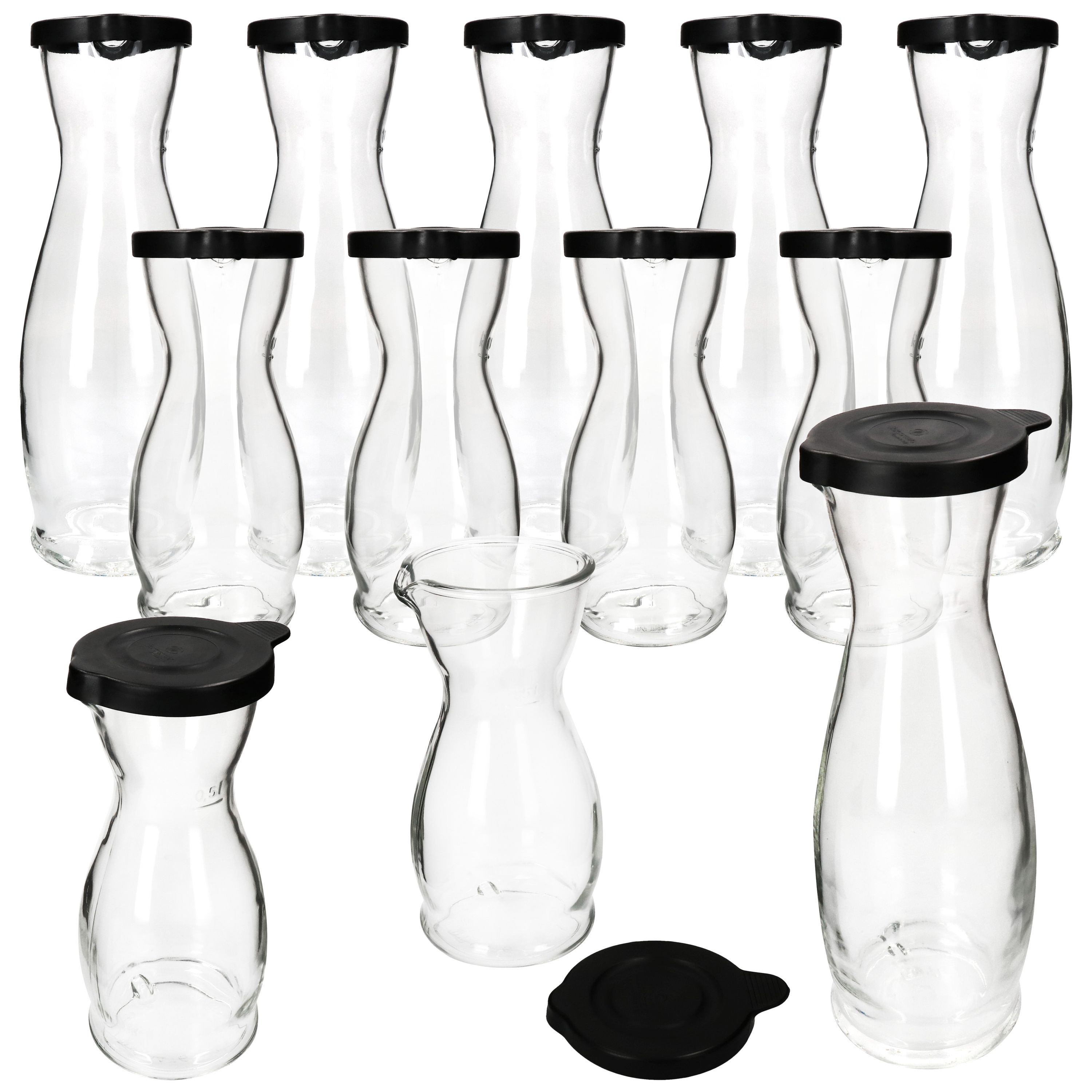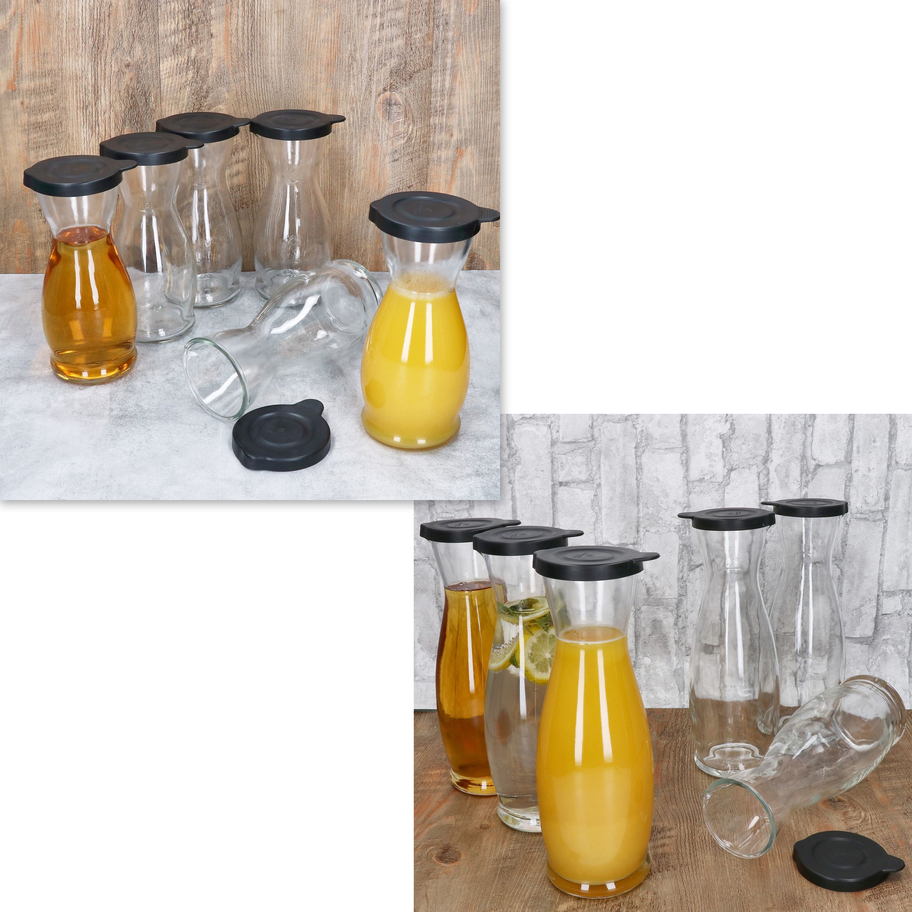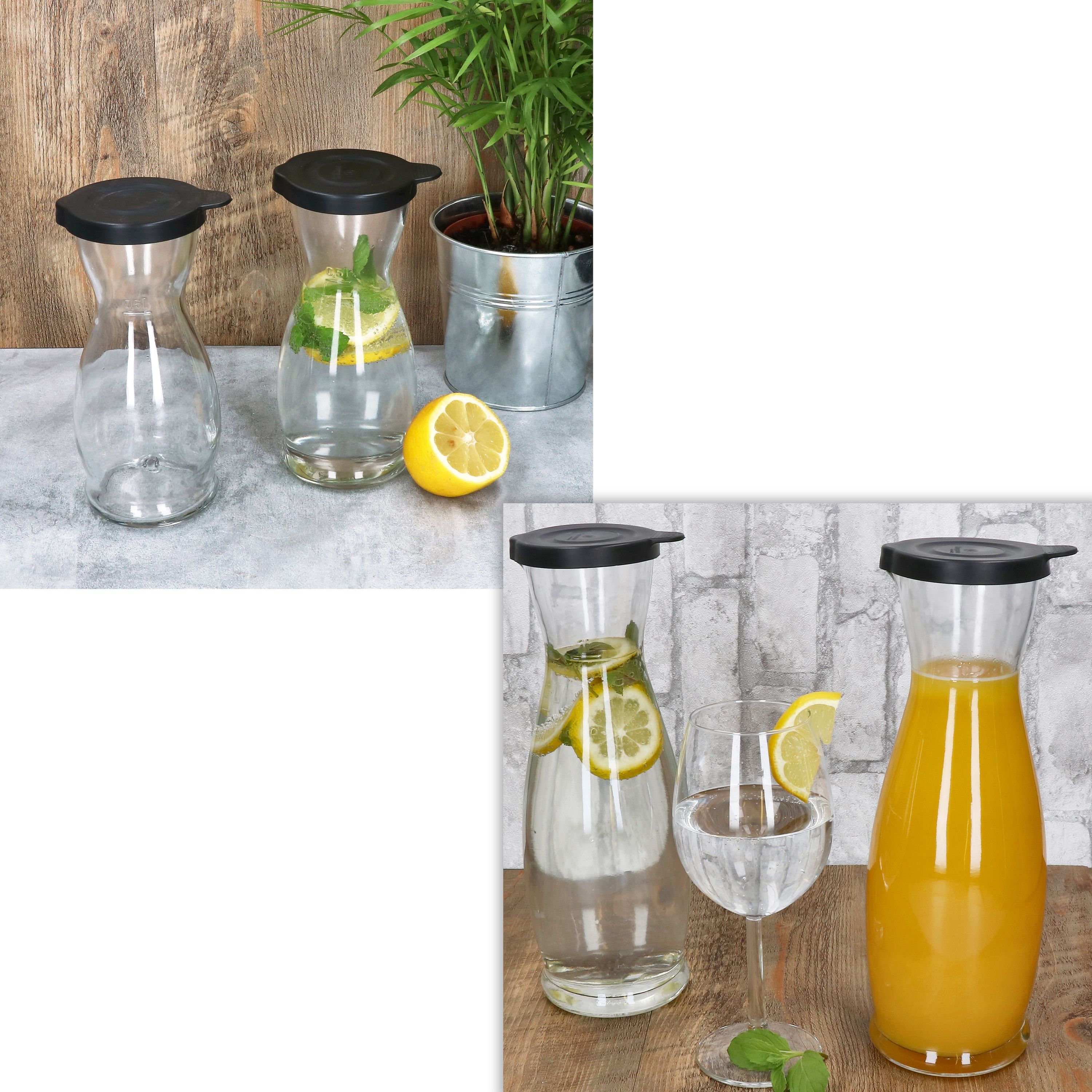 12er Set MIA Misura Karaffe 6x 0,5 Liter & 6x 1 Liter geeicht aus Glas mit schwarzem Kunststoff-Deckel - 13173018S & 13172818S