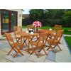 Our 7-piece patio dining set includes 1 bistro table and 6 patio chairs that could sit up to 6 people easily. Enjoy your family time with this gorgeous 7-piece outdoor set. This patio set is made with fine Acacia Wood for toughness and endurance. This oval-shaped modern table is developed in a distinctive style with unique aspects, and modern dining chairs will attract everyone who comes to the yard area, and arms are very suitable for use. The outdoor chairs also have a ladder back to keep your back at a comfortable level as you enjoy your favorite outdoor spaces. This garden set also features a convenient folding function that provides easy storage when it is not in use. The sturdy wood structure retains its looks and beauty throughout the seasons. The outdoor dining chairs contain X-style legs for the highest durability. This patio folding dining set seems like a decorative addition to your garden, porch, or patio. Our wood patio set is easy to clean using a damp towel. Each patio bistro set comes conveniently with easy-to-follow guidelines and all required tools included. You need to follow the procedures in the handbook to complete the installation in a short time.