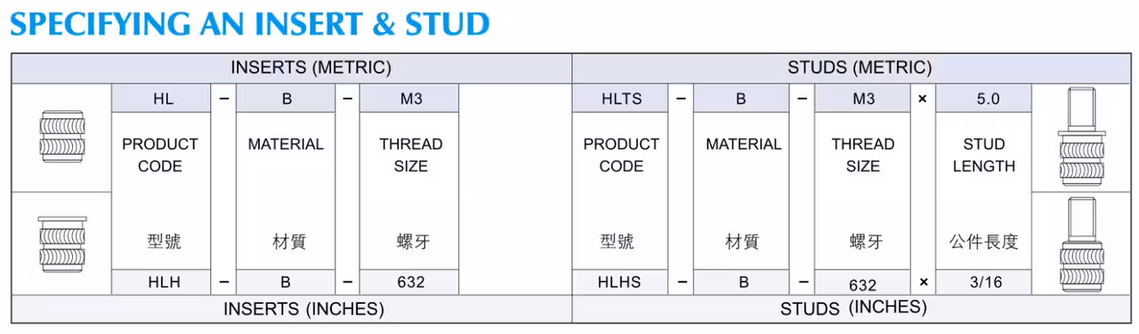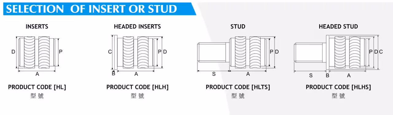 Insert Type HL & HLH and Stud Type HLTS & HLHS series - Designed for installation into notch sensitive amorphous thermoplastics by heat. It features rounded knurls, avoiding the stress raising sharp crests and roots which typify knurls used on most inserts.