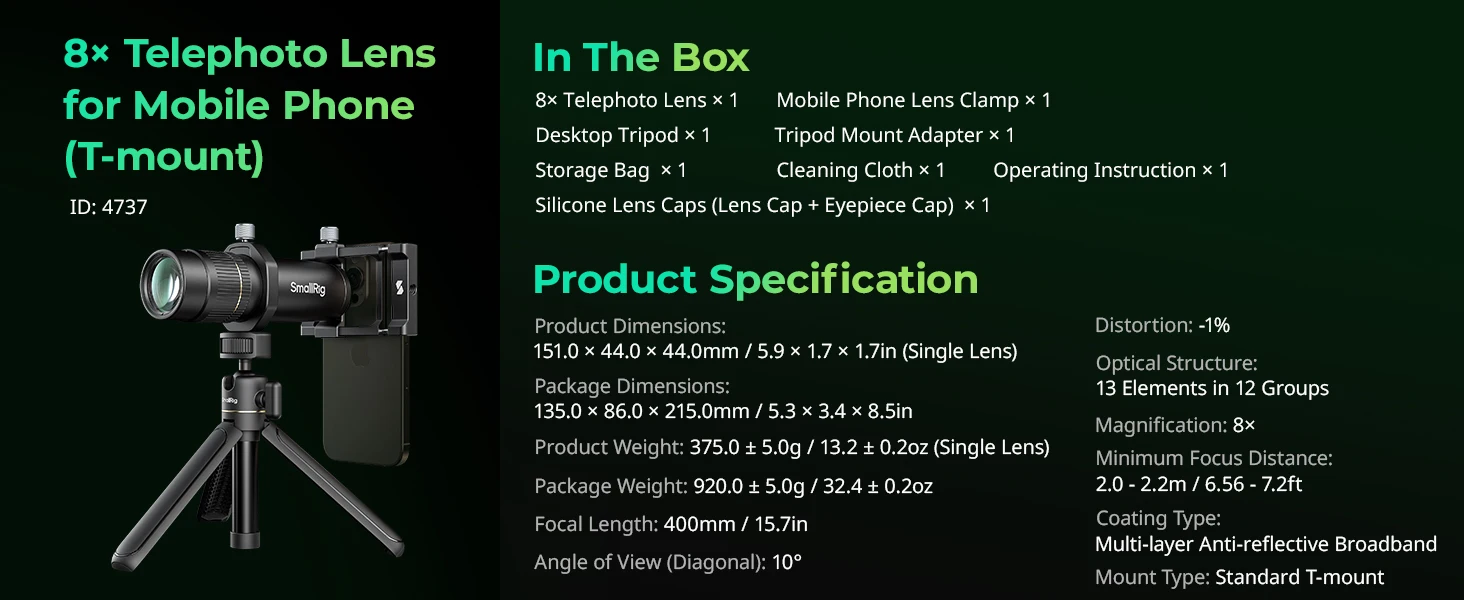 SmallRig 8x Telephoto Lens for Mobile Phone (T-mount) 4737 is designed for mobile phone photography, capturing intricate details of distant objects, and enhancing depth of field without compromising image quality. Ideal for both photo and video shooting, it elevates users' content with a professional touch.