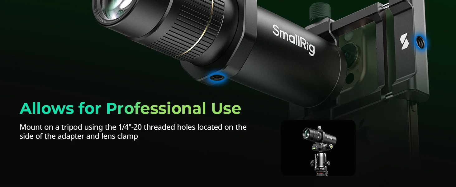 The adjustable position and locking knob on the clamp ensure precise alignment with the lens, avoiding vignetting and enhancing the user experience. Compatible with iPhone 12 / 13 / 14 / 15 / 16 series, the lens clamp and lens adapter feature 1/4"-20 threaded holes for mounting onto larger tripods, offering versatility in usage.