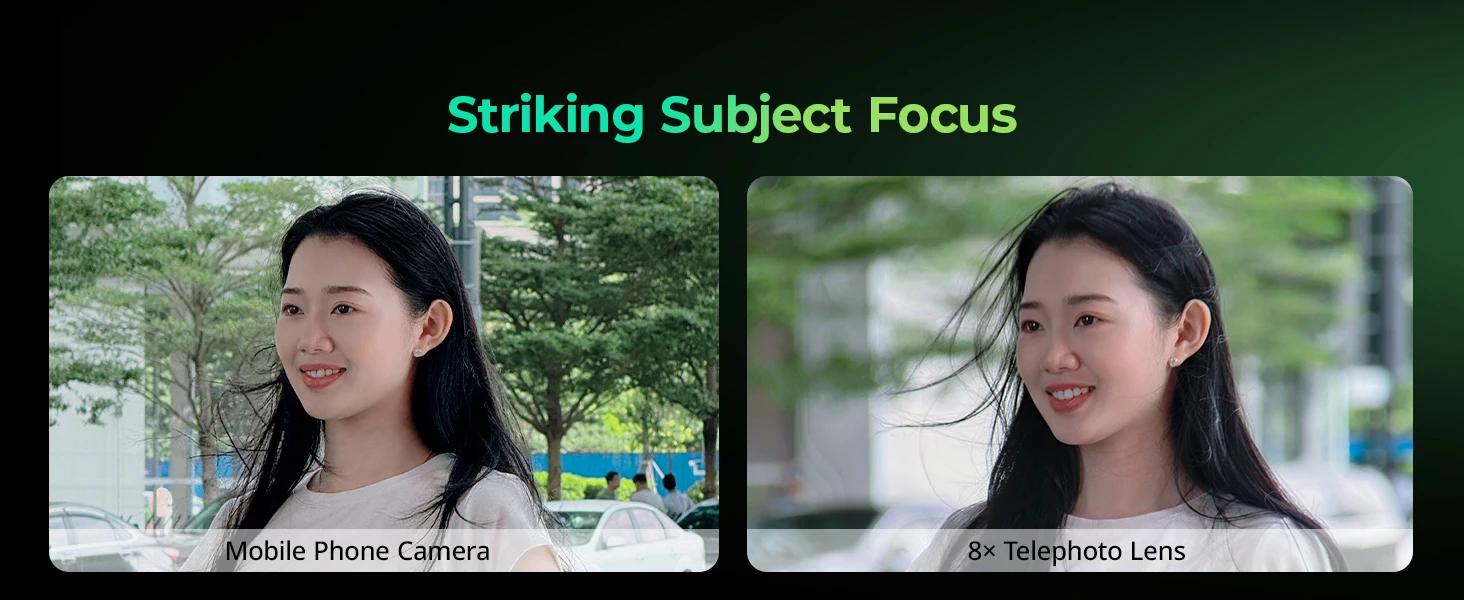 1.The telephoto lens offers an adjustable 8x magnification, highlighting subjects with a shallow depth of field for a compelling, compressed effect. Long-distance shots are crisp and distortion-free in high definition. The focus adjusts with a simple twist. If you encounter vignetting, zoom in the camera to 1.1x or higher.