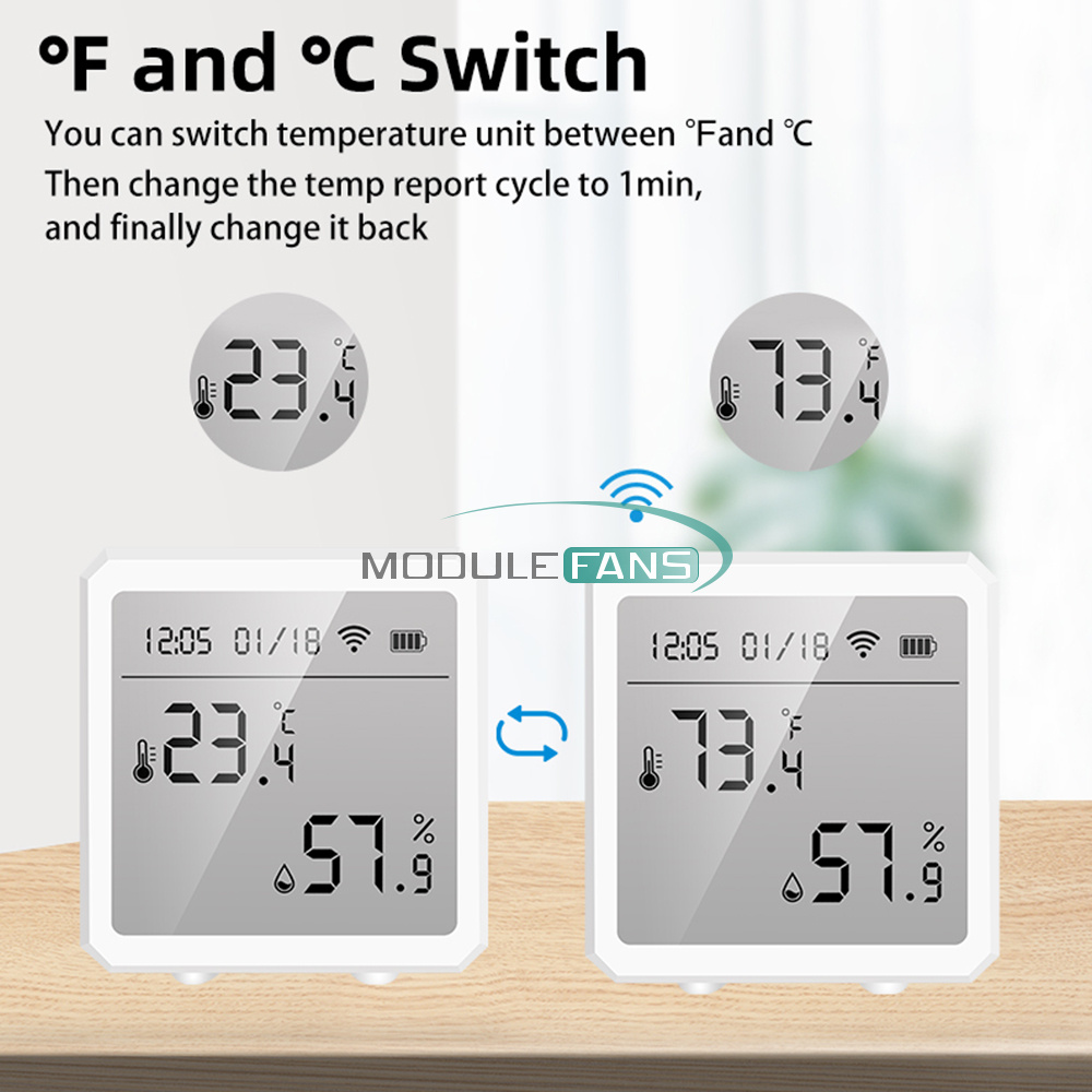 The sensor is designed with a switch between Celsius and Fahrenheit temperature display. You can select the unit to be displayed as required. The speed of the switch is related to the data update frequency set. You can select the update frequency for one minute first, and then the temperature switches to the new unit after one minute, and then switch the data update frequency to the time you need