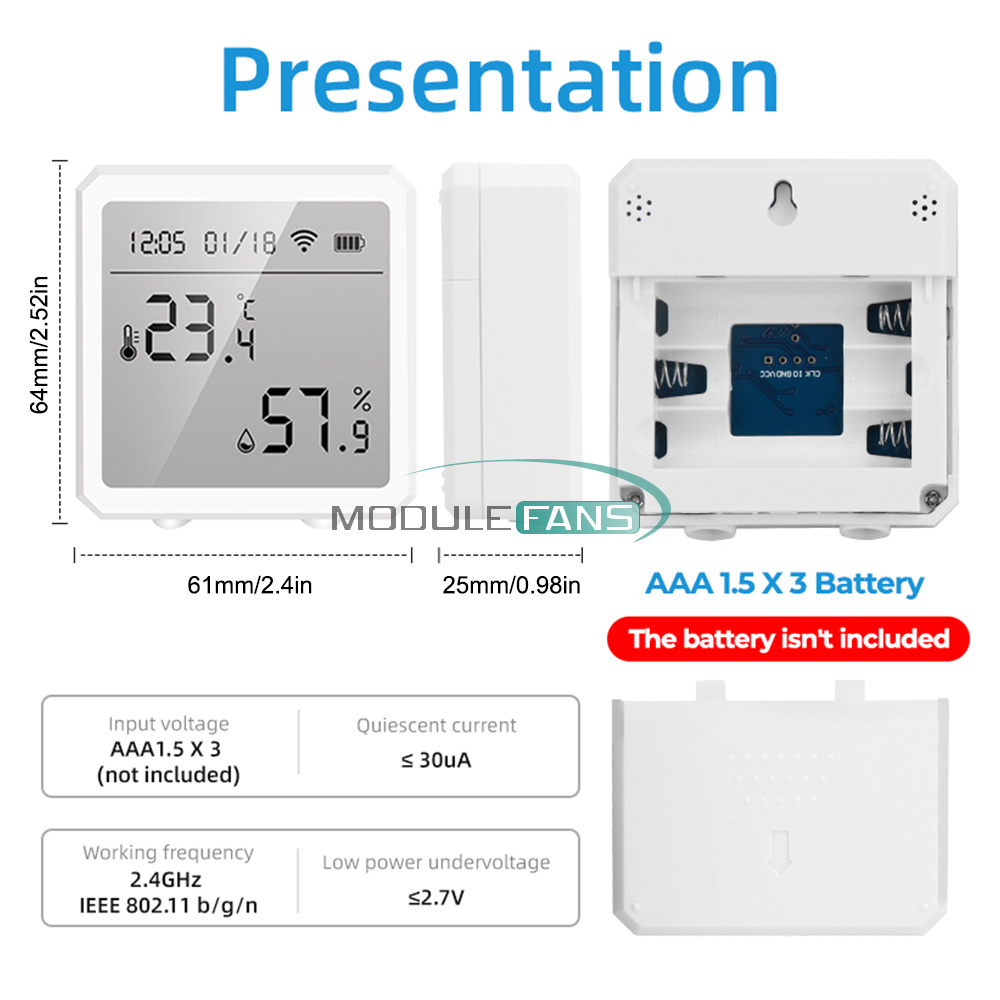 Battery powered AAA1.5V*3 (batteries are not included in the delivery), low power consumption, according to the system default settings, can last approximately 1 year.