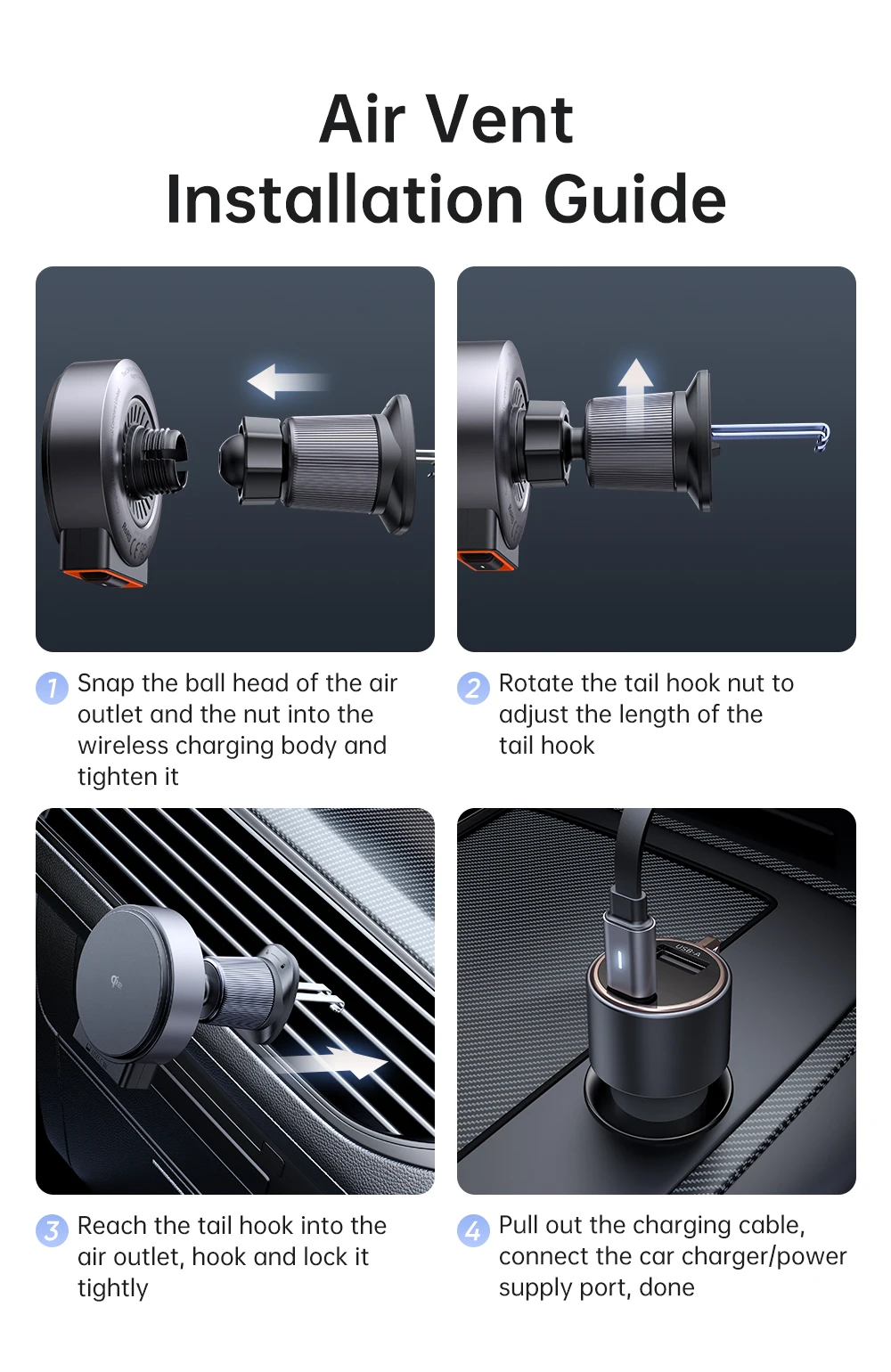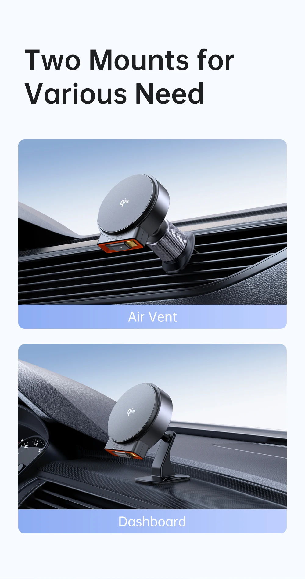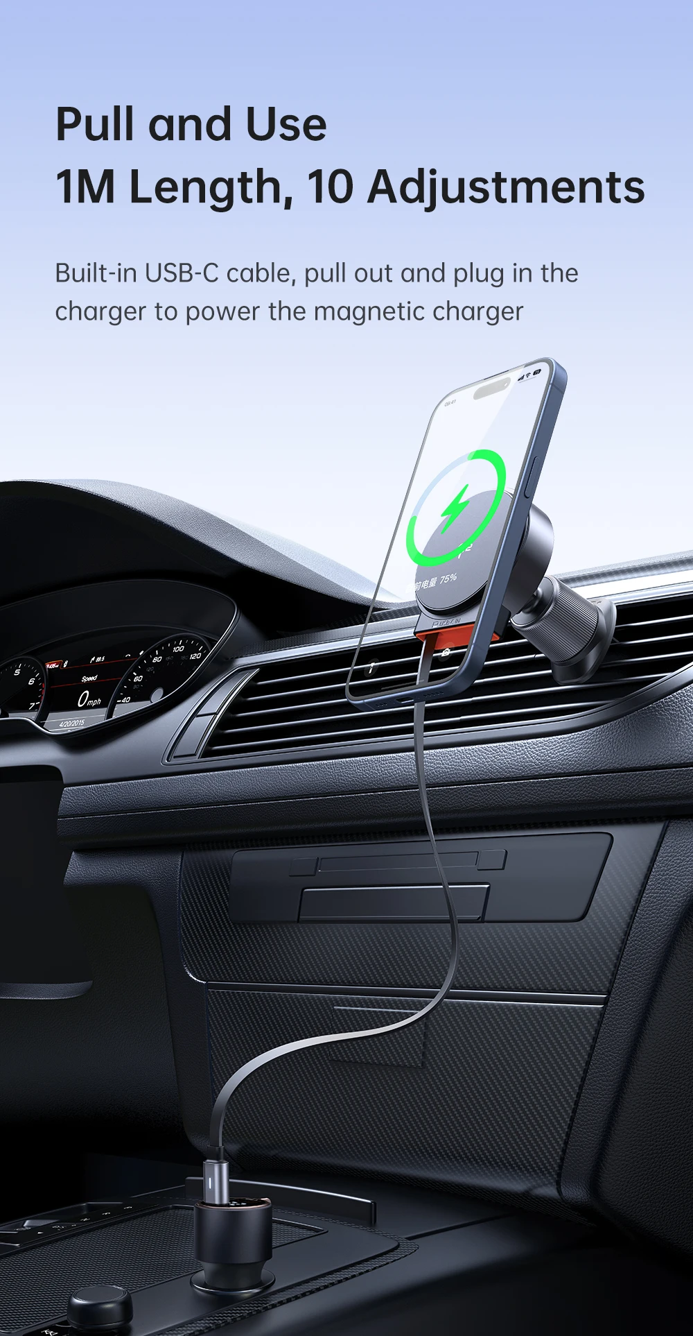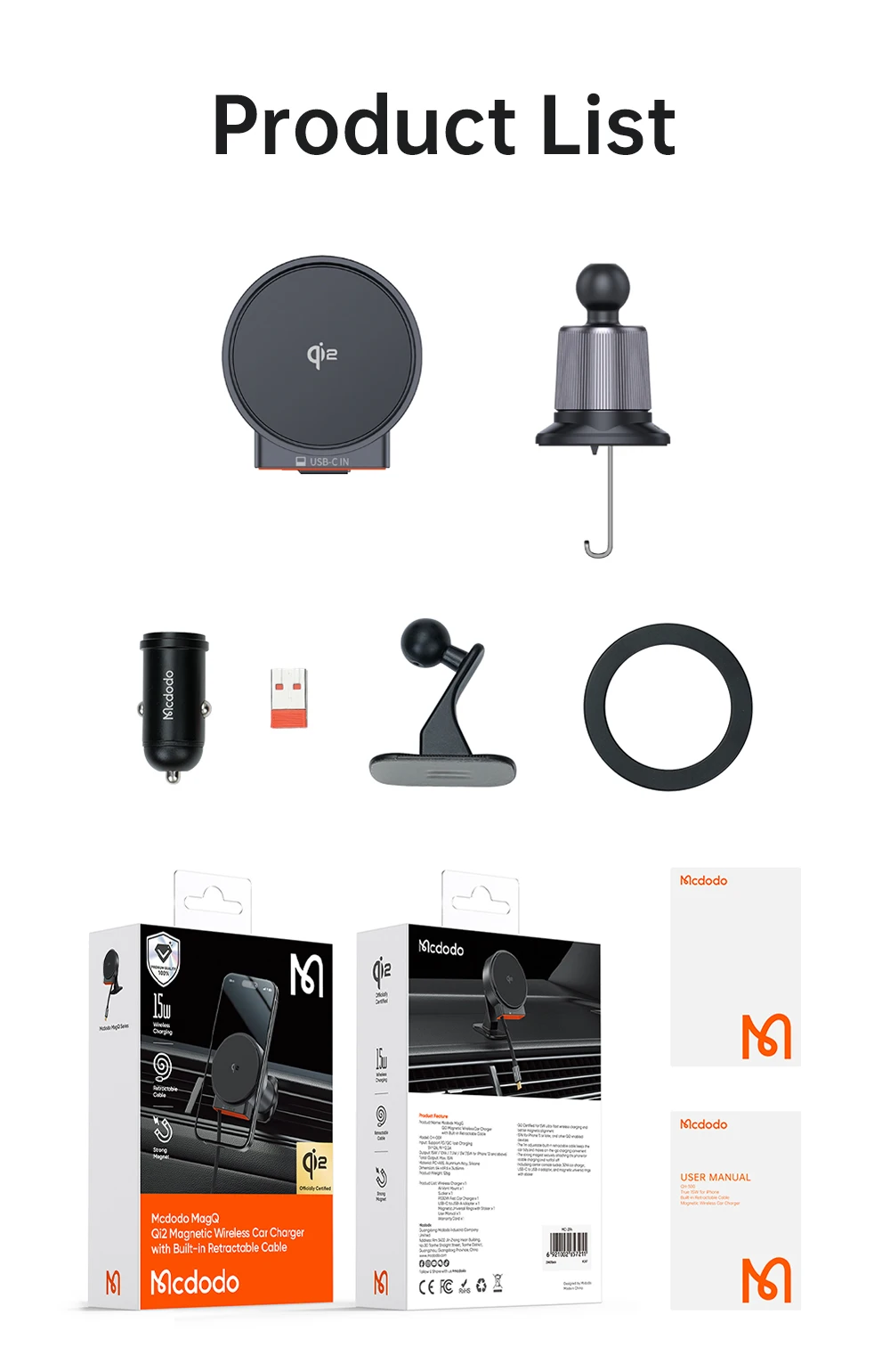 High light | 1. Qi2 Certified for 15W ultra-fast wireless charging and better magnetic alignment 2. 15W for iPhone 12 or later, and other Qi2-enabled devices 3. The 1m adjustable built-in retractable cable keeps the car tidy and makes on-the-go charging convenient 4. The strong magnet securely attaching the phone for stable charging and not fall off 5. Includes center console sucker, 30W car charger, USB-C to USB-A adapter, and magnetic universal rings with sticker |