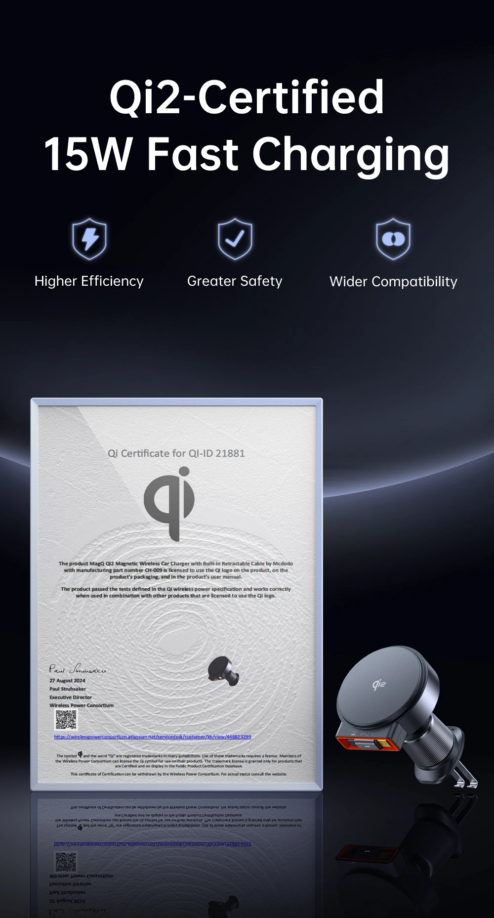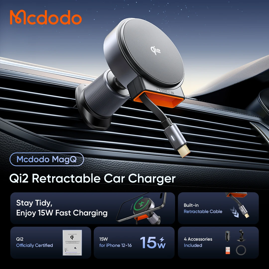 Model | CH-009 15W Qi2 Magnetic Wireless Car Charger Built-in Retractable Cable (Qi2 Officially Certified) |
