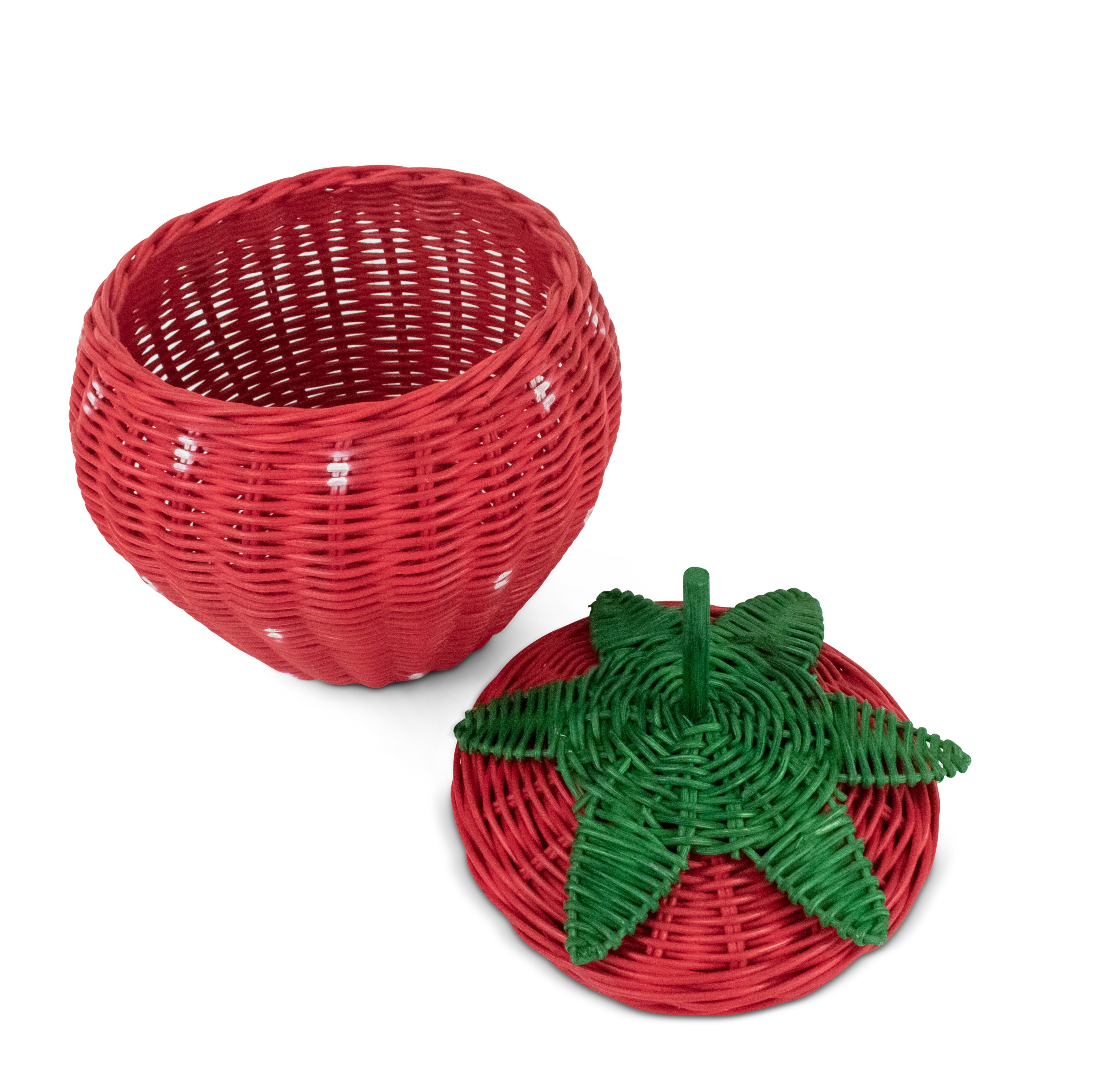 Our strawberry basket is handwoven out of red rattan, speckled with white 'seed' dots and topped with a refreshing green 'stem' lid. A handmade beauty, the wicker basket with lid leaves a lasting impression. Use it in the kitchen to store fruit, in the office to nest away accessories or in the classroom to keep teaching supplies organized.