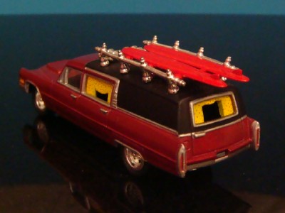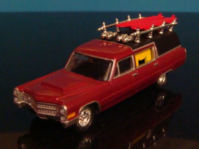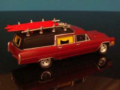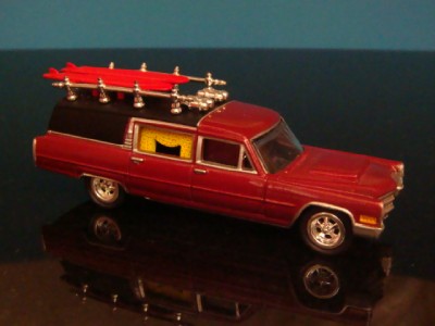 VARY RARE HOT ROD CADILLAC SURFING HEARSE FLEETWOOD COACH DIECAST MODEL BY JOHNNY LIGHTNING ADULT COLLECTIBLES. FINISHED IN METALLIC MAROON WITH COFFIN RACK A TOP WITH TWIN SURF BOARDS A WAY COOL DIECAST REPLICA WITH LIFE LIKE DETAILING. ALL RIDING ON LOW-PROFILE TIRES MOUNTED ON CHROME CRAIGER TYPE MAG WHEELS. A TRUE WORK OF MINIATURE AUTOMOTIVE ART.