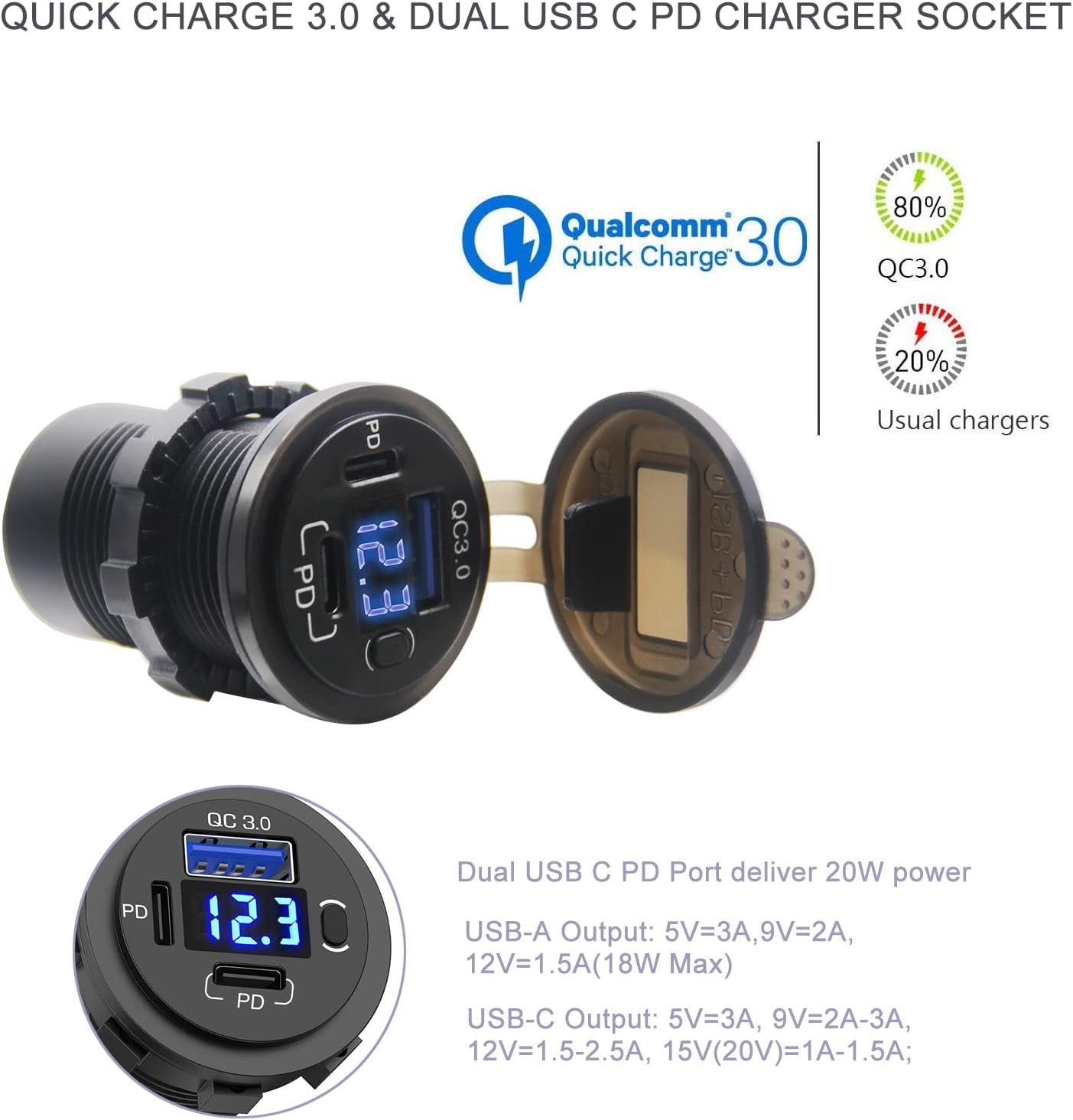 - 【60W Dual PD USB C Outlet】Dual 12V USB C Power Delivery fast charging ports with total output up to 60W (30W output per PD port), Qidoe 12 volt outlet socket can charge three devices simultaneously. Faster charging speed for your iPad pro , iPhone 13/12/11 Mini/Pro/Max, Only 20W fast charging is possible for Samsung S series phones.Samsung GalaxyS22,S21,S20 S10 etc: 3x charging from 0% to 60% in 35 minutes, saving you more than 90 minutes.