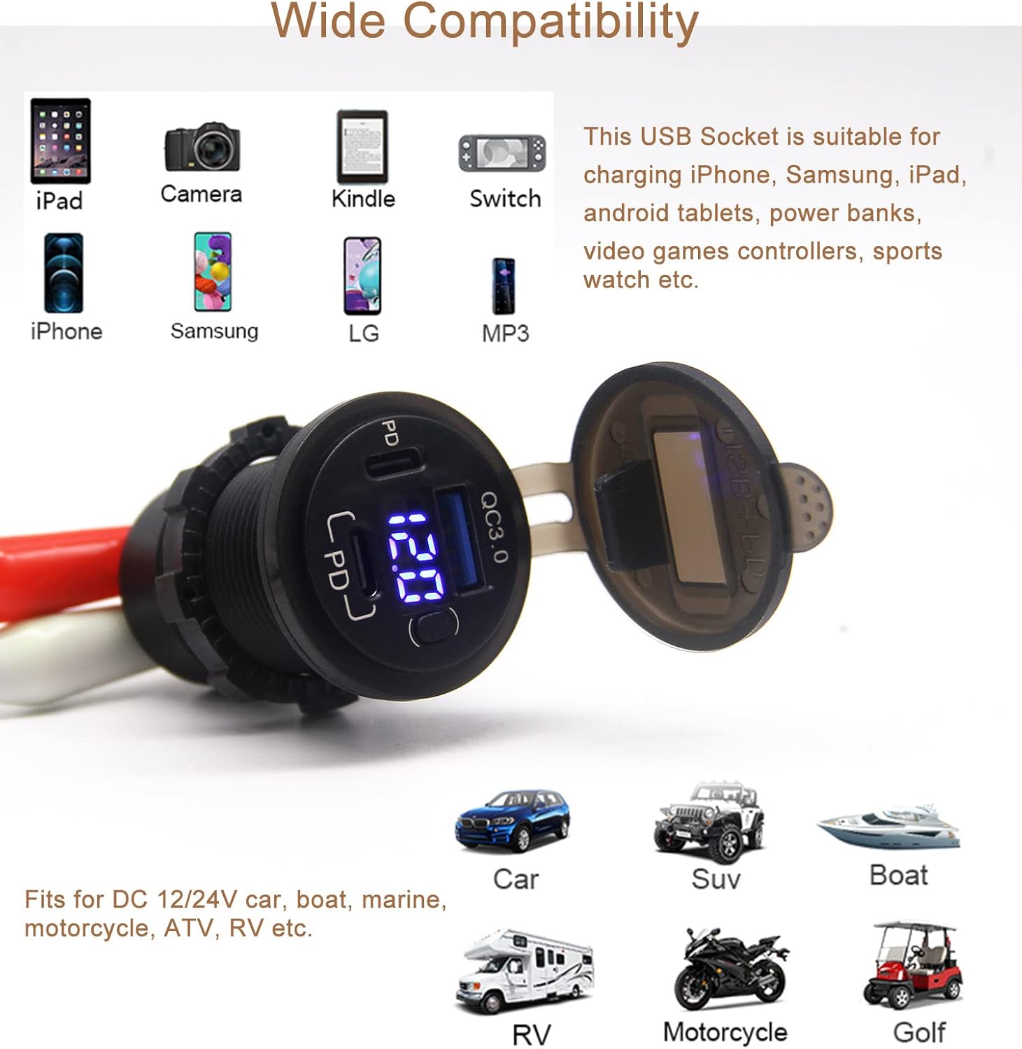 - 【Wide Compatibility】This 12 volt USB multi port comes with a removable waterproof cover for water and dust resistance. The multi port car charger can be installed in all 12V-24V vehicles, boats, ATV, motorcycles, trucks, golf carts, RVs, boats, car etc.