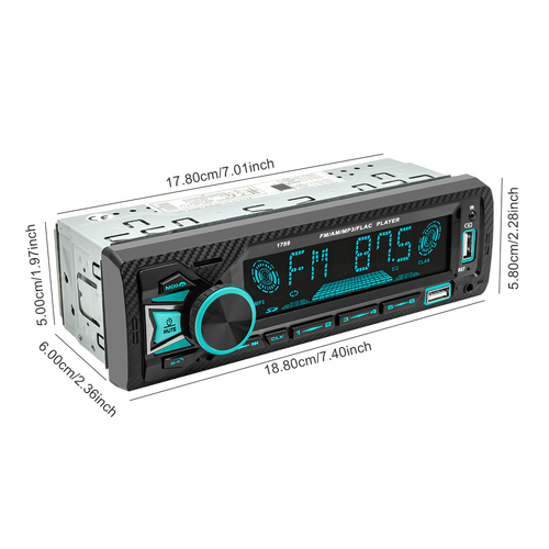 There are powerful functions, such as hands-free calling, audio transmission mode, mobile phone APP controlling, digital stereo FM radio, three-band radio storage FM1-FM2-FM3(18 radio stations can be preset, FM: 87.5-108MHz), USB/TF card reading, folder playback function, remote control, rotating electronic volume control, front AUX audio input hole, rear terminal L/R audio RCA output hole, 4-channel high-power output, and colorful light display.