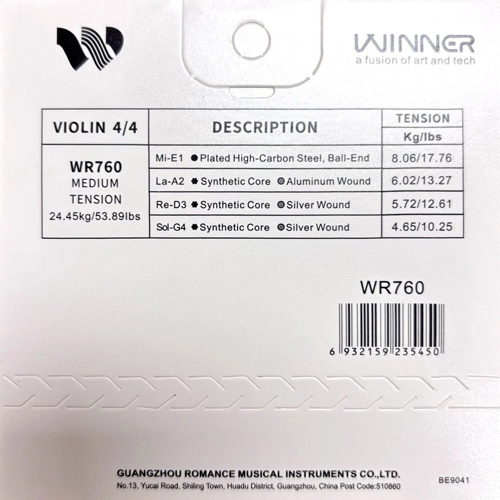 - The core of the WR760 violin string is made of a special synthetic material , which is wrapped with High carbon plated steel (E string), aluminum (A string), silver (D and G string). The sound is warm yet powerful. With this string the entire bandwidth for dynamic and solo playing is possible.