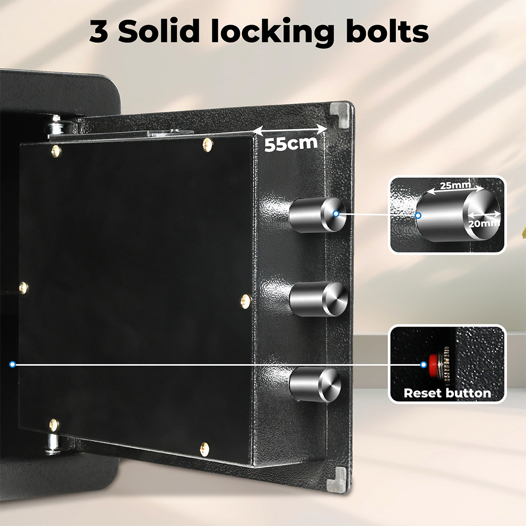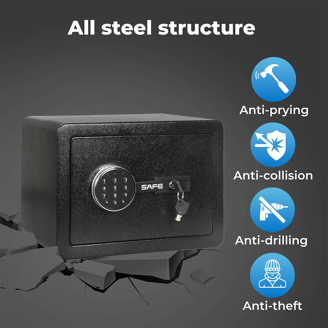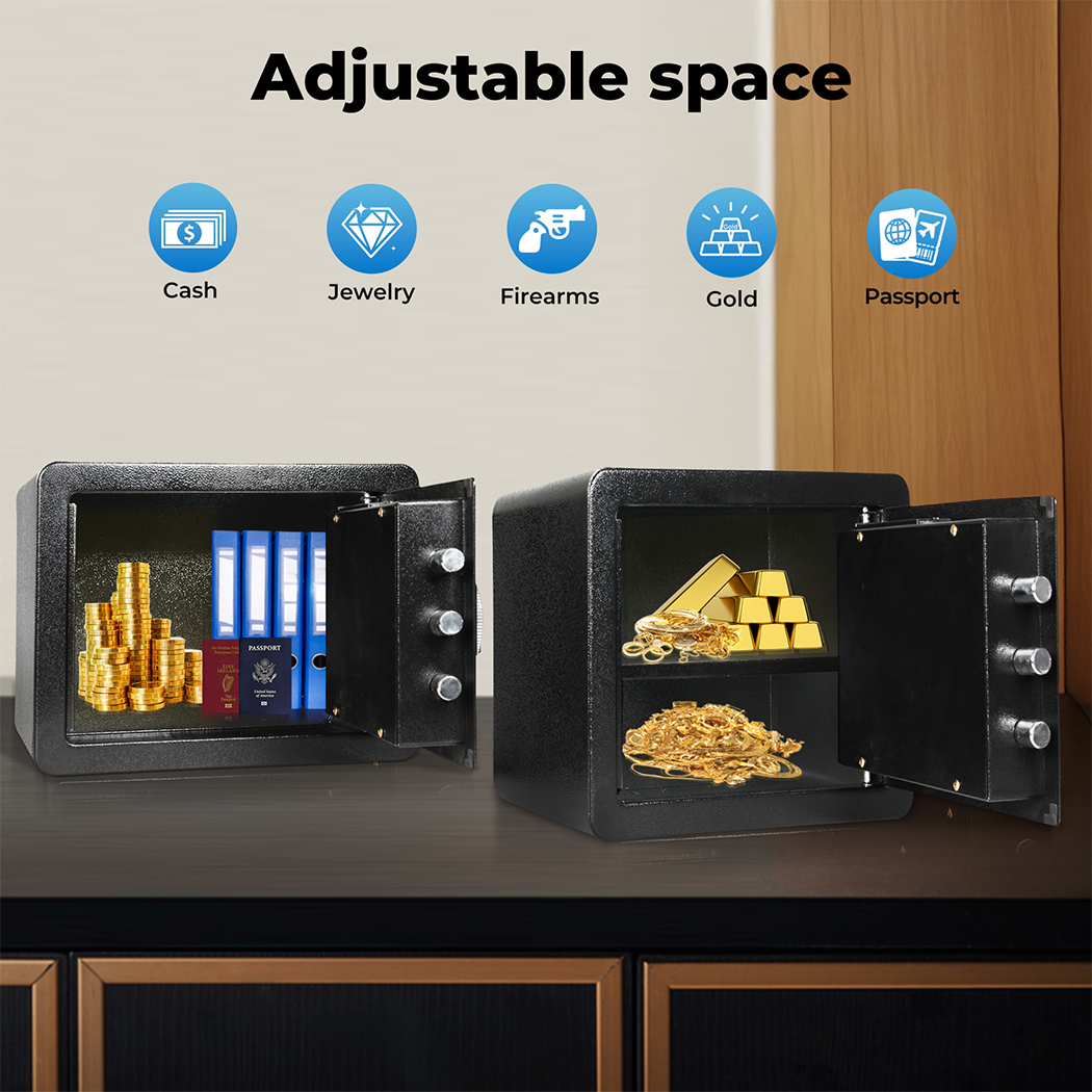 Protect your valuables with this secure digital safe – the perfect safe box for cash, documents, jewelry, and more! Whether you're looking for a small safe to store your money, a gun safe to keep firearms secure, or a fireproof safe to protect important documents from fire damage, this security box has you covered. It features an easy-to-use key safe system and a robust lock box design, making it an ideal choice for home, office, or travel. Keep your peace of mind knowing your most valuable items are locked up tight in this durable, fireproof document box. This money safe is a must-have for anyone who values security and protection – get yours today and experience the ultimate in safe storage!