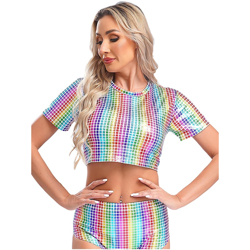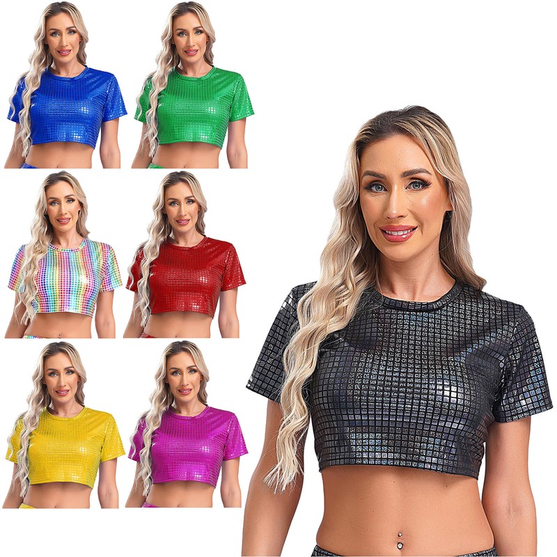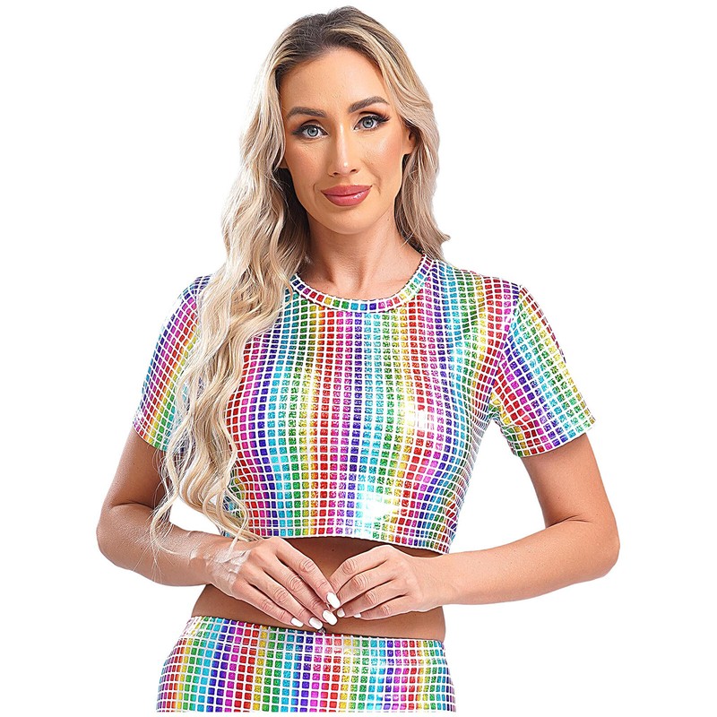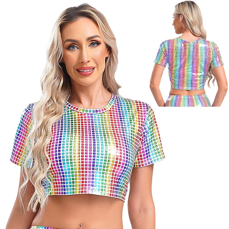 Women’s crop top with metallic plaid that sparkle under the light to make you stand out in the crowd.