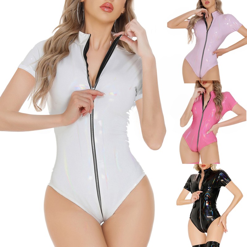 Leotard bodysuit style, it is designed with short sleeve and mock neckline. Tight fitting enhances body curve.
