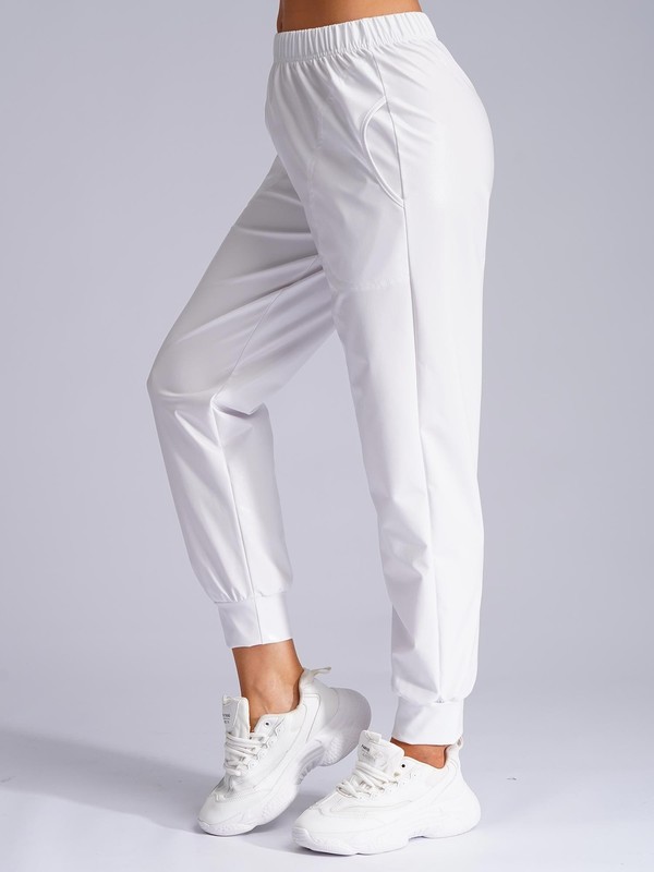 High waist, long pants, elastic design at waist and ankle are stretchy to fit. Slant pockets at both sides.