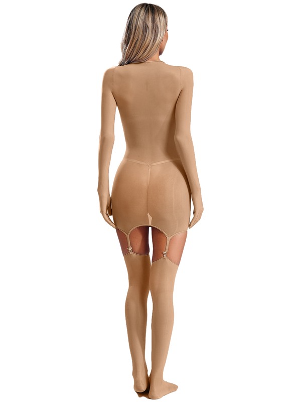 Designed with mock neck, long sleeve with five-fingers style, thigh length jumpsuit with elastic suspenders and stockings.