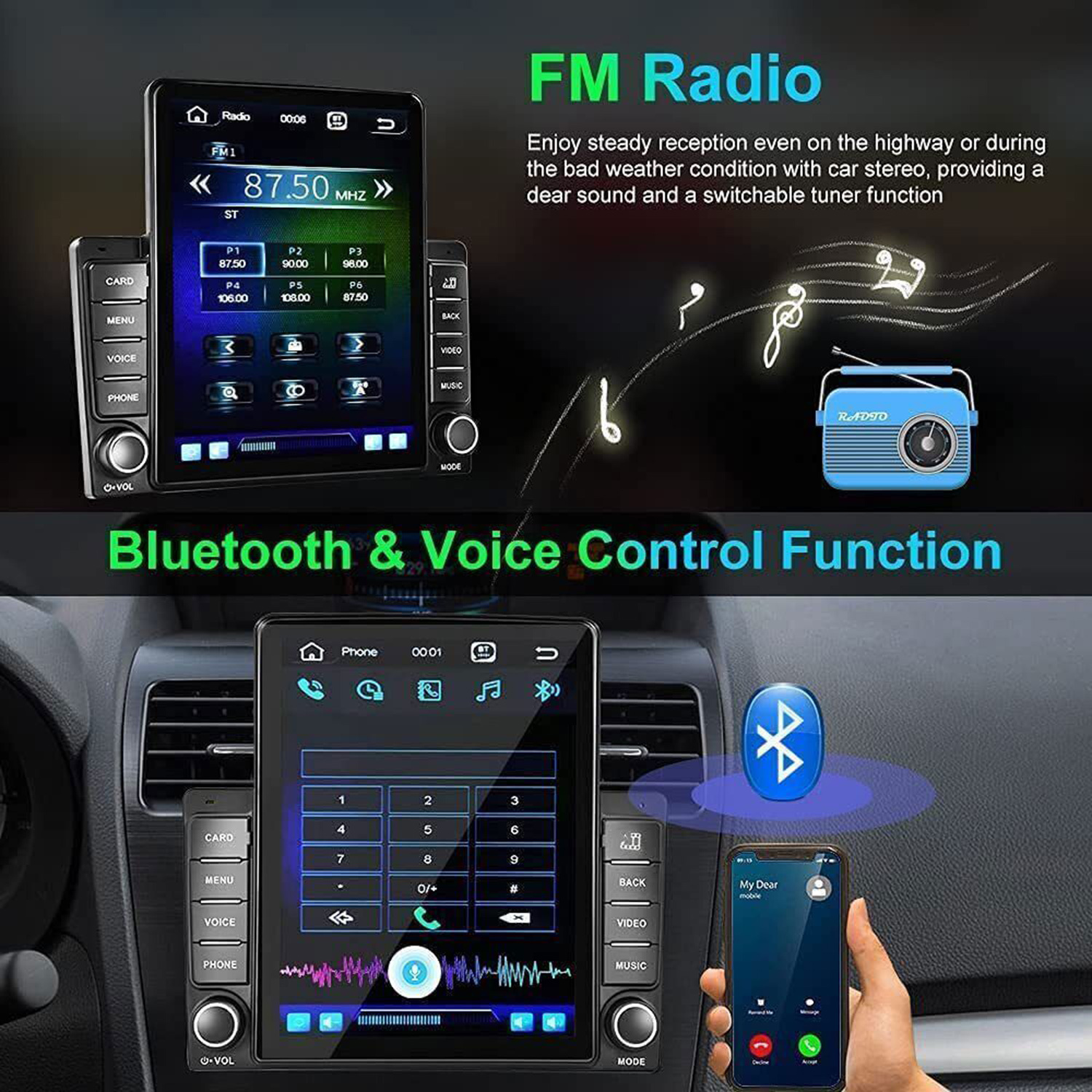 16.FM Radio: Online music you can transfer the music to the car stereo by FM to enjoy the original car stereo sound,with 18 preset stations