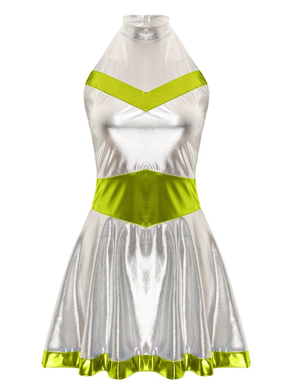 Adorned with color block patchwork at chest, waist and hem. Holographic shiny surface brings dazzling and unique luster to make you stunning.