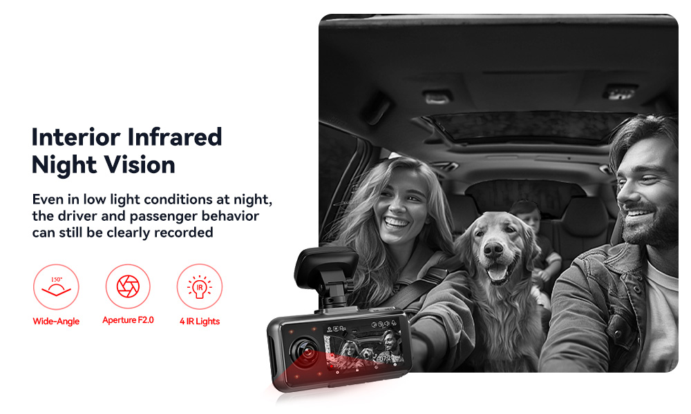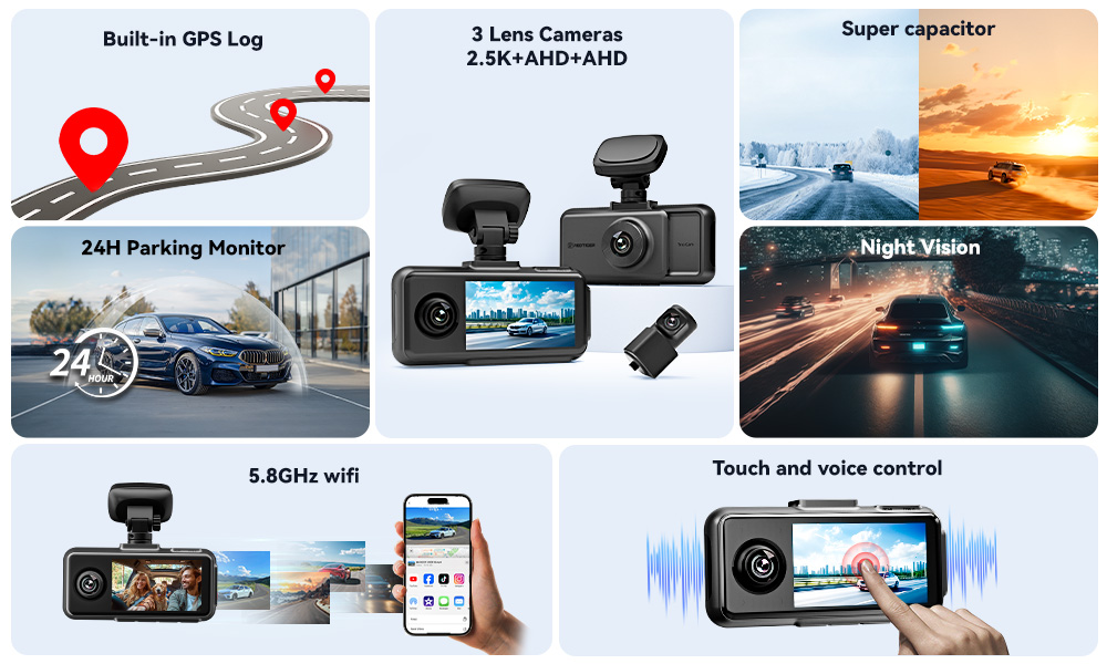 Advanced 3-Channel Recording:Experience unparalleled coverage with the A6's innovative 3-channel recording system. The front camera delivers crystal-clear 2.5K video, while the interior and rear cameras provide sharp 1080P footage, ensuring that every angle is captured.