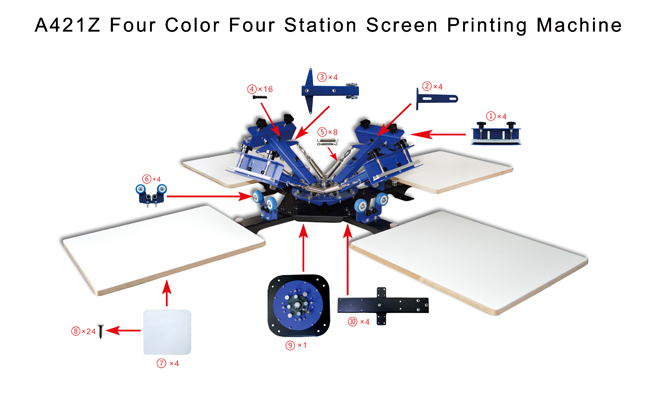 It is mainly used for the four color T-shirt overprinting, it is configured with four screen frame chucks and four t-shirt pallet stations. The screen frame part can rotate at 360 degree. Users can operate at any station. This machine is manual mobile screen frame to match color, All the screen frames’ position is correct to any one pallet, the other one pallet will be correct, then the user can start overprinting. There is no need to correct the position of the color one by one.
