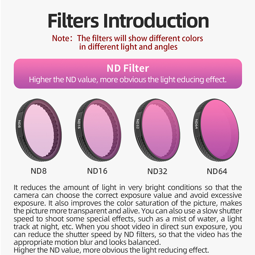 l Types (Optional): MCUV, ND8, ND16, ND32, ND64, ND8/PL, ND16/PL, ND32/PL, ND64/PL, CPL, Mix & Match 3-Piece Set, Mix & Match 4-Piece Set, ND/PL Filter 4-Piece Set, ND Filter 4-Piece Set