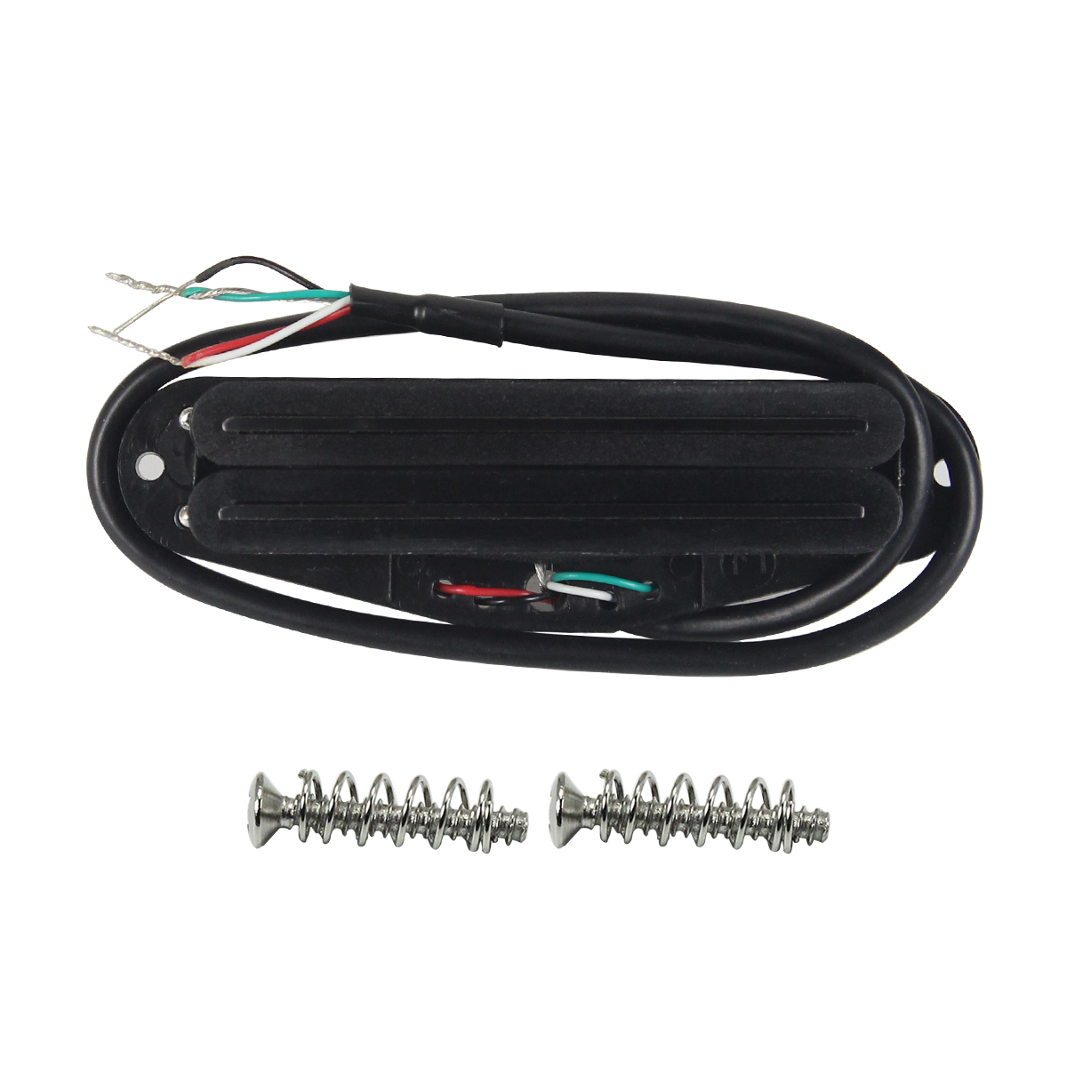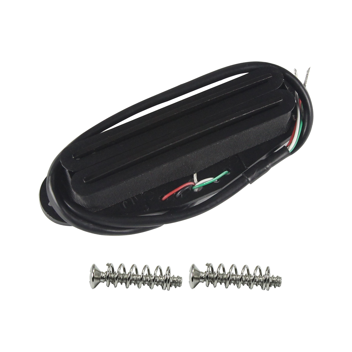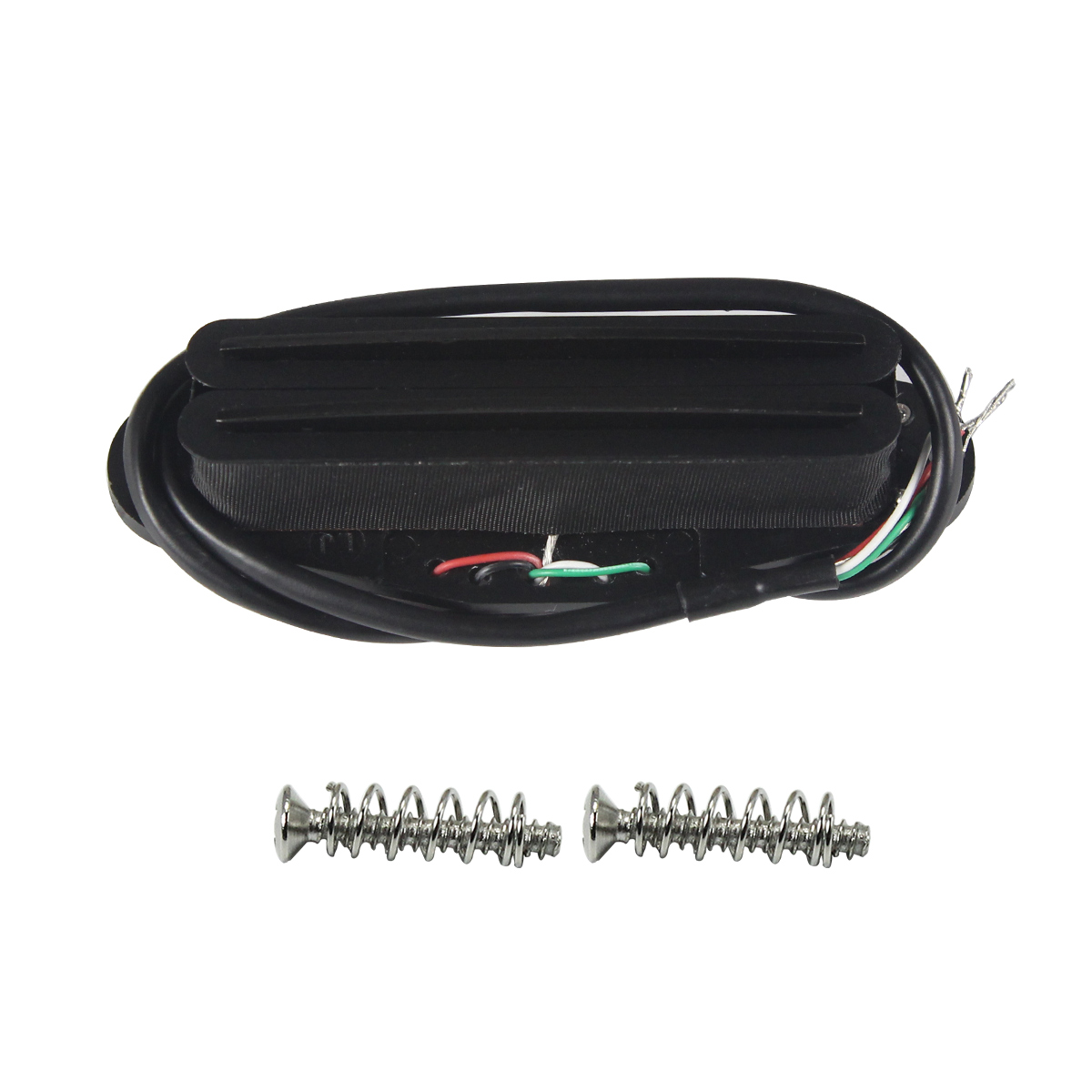Specifications: Dual Dual Rails Humbucker Pickup For FD ST Style Electric Guitar or Similar Guitar Parts Replacement. A Dual Railspickup is that the strings never leave the full magnetic field of the pole piece, even when a string is bent. so that string spacing is not an issue; no matter the string spacing at the bridge or nut, each string will be properly aligned with the rail. Can used for all Neck/Middle/Bridge Position, but the low resistance more suit for neck position, high resistance more for bridge position. These are fully wax posted, low noise! Magnet: Ceramic Resistance: 12-13k Color: Full Black Out There are 4-wires allowing the option of coil-tapping, if required, or can be wired as per a traditional 2-wire humbucker. ๐ธWires Color Code: the black & bare wires for ground; the green wire for signal (hot wire); the white & red wires together for coil split (series cable). Packing List : 1 x Guitar Pickup 2 x Screws 2 x Springs