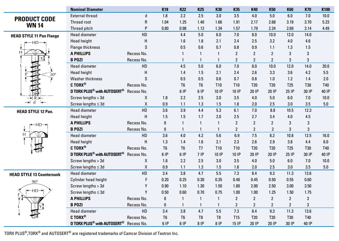 PT® SERIES – Designed for use in thermoplastics, its key design features include a profiled thread root to assist plastic flow, a 30° flank angle to reduce boss bursting forces and an 8° pitch angle.